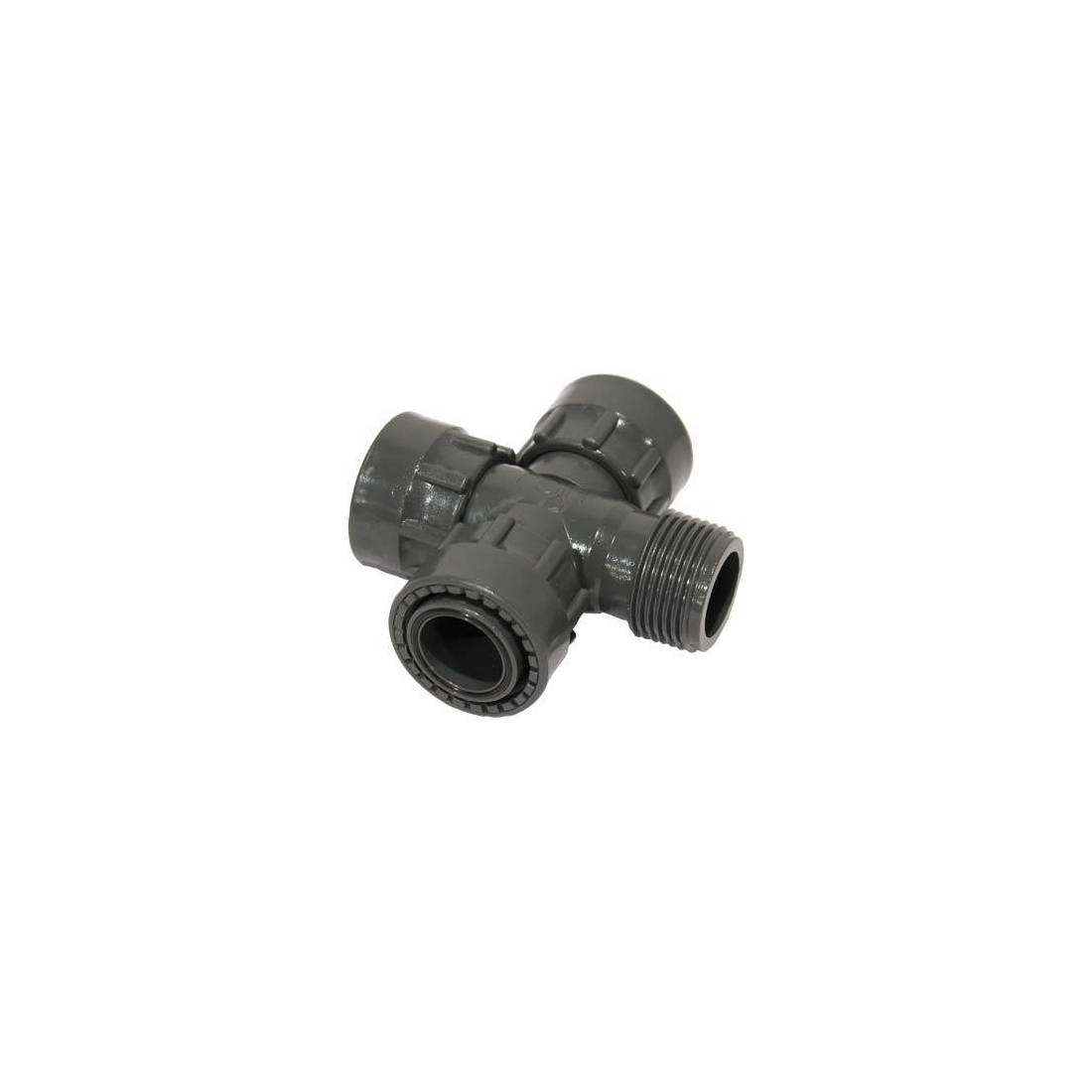In PVC altamente resistente. Con O-Ring di tenuta premontato e ghiera. PN12,5. Triplo filetto femmina e filetto maschio.