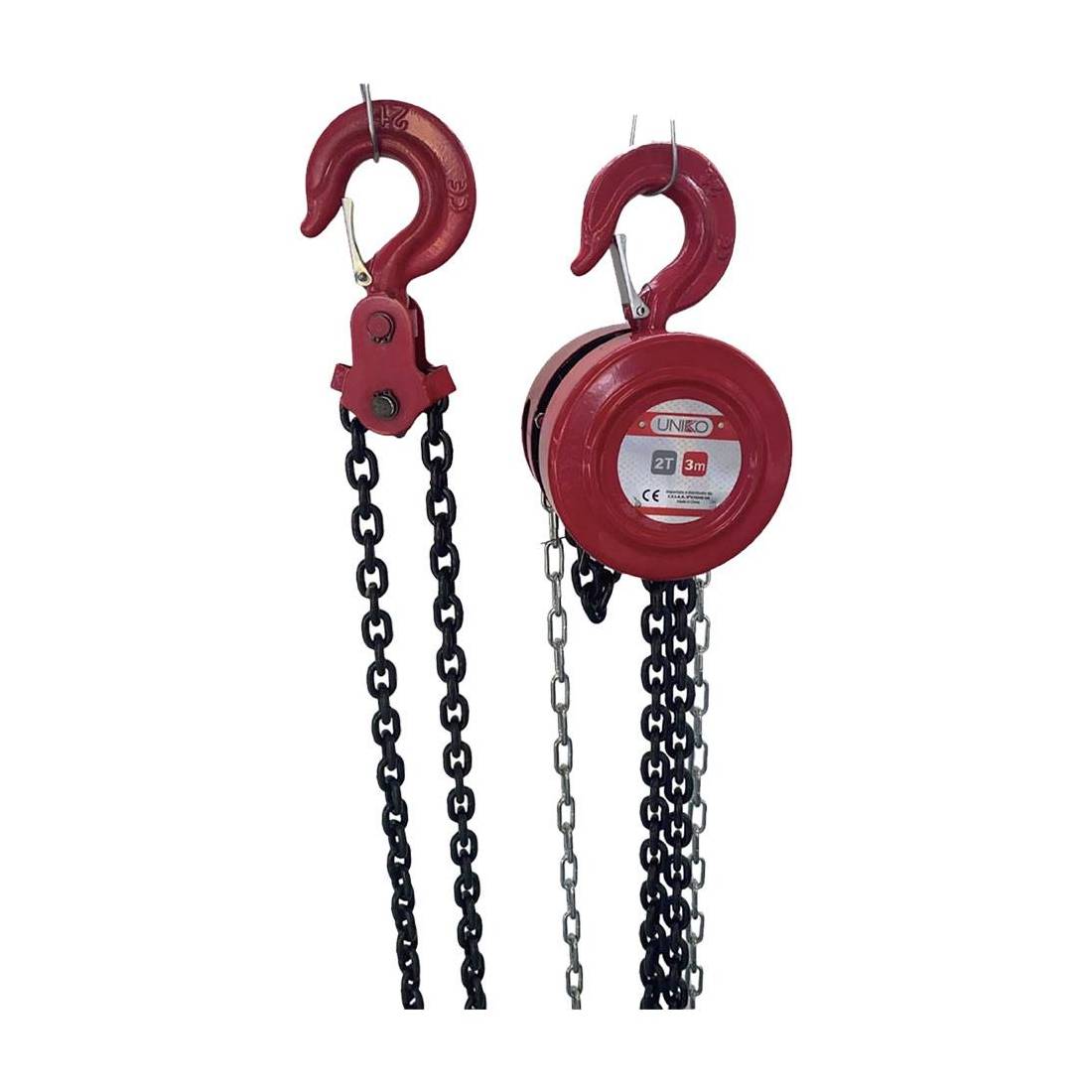 Indicato per officine e garage in operazioni di sollevamento di oggetti molto pesanti. Aggancio superiore con sicura, catena di sollevamento da 3 metri. Prodotto a marchio CE.
