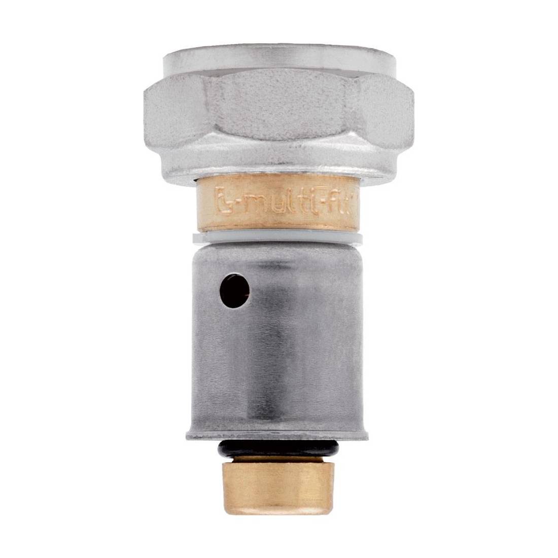 Per tubo multistrato, PEX e polibutilene. Dado in ottone nichelato, codolo in ottone. Temperatura minima e massima d'esercizio -20°C, 110°C. Pressione massima 20 bar. Fornito con o-ring per sedi coniche e guarnizione per sedi piane.