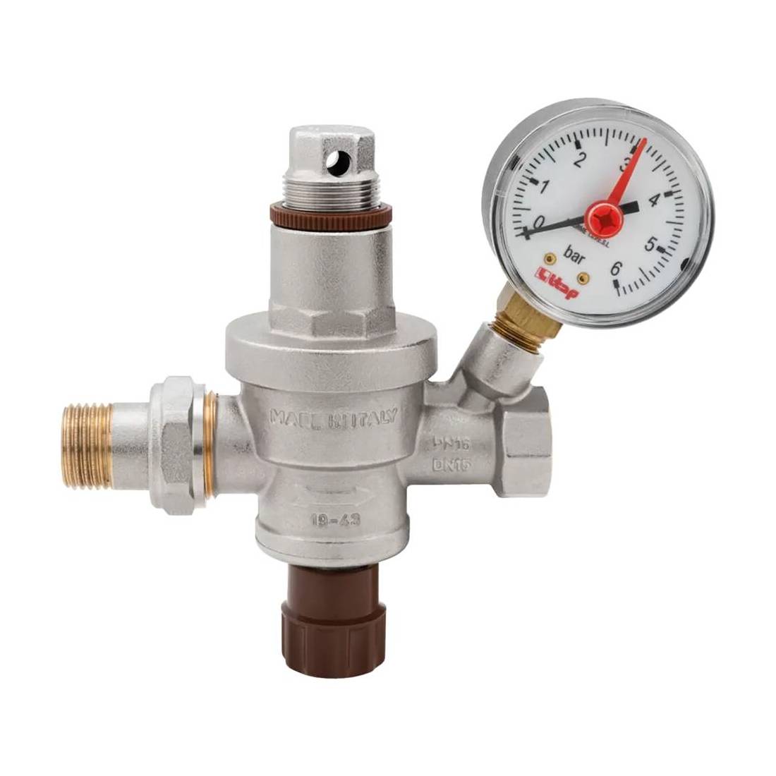 Consente di reintegrare automaticamente l'acqua che fuoriesce dall'impianto di riscaldamento. Corpo in ottone. Completo di rubinetto di intercettazione, filtro in acciaio inox e valvola di ritegno. Funzionamento a pistone. Pressione massima in entrata 16 bar, in uscita regolabile fra 0,5 e 4 bar. Pretaratura in fabbrica 1,5 bar, attacco manometro 1/4'. Temperatura minima e massima di esercizio 0°C, 80°C. Attacchi filettati ISO 228. Fornito con manometro, scala 0-6 bar.