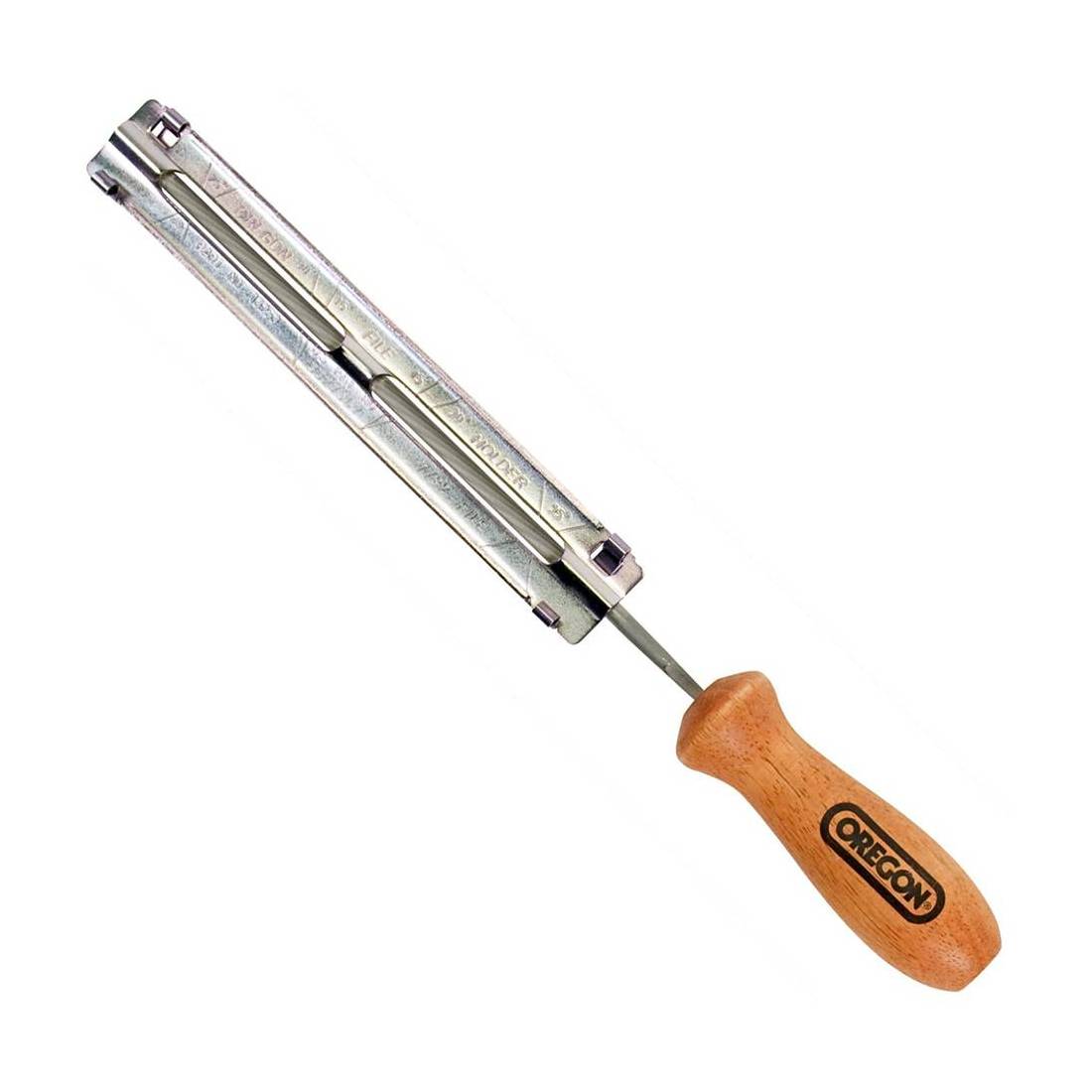 Completo di manico, lima e guida. Ottimo per affilare i taglienti delle catene per motosega. Le tacche sul bordo della guida agevolano l'allineamento della lima per ottenere l'angolo corretto di affilatura sulla piastra superiore del tagliente. Adatta per catene passo 1/4 e 3/8 low profile.