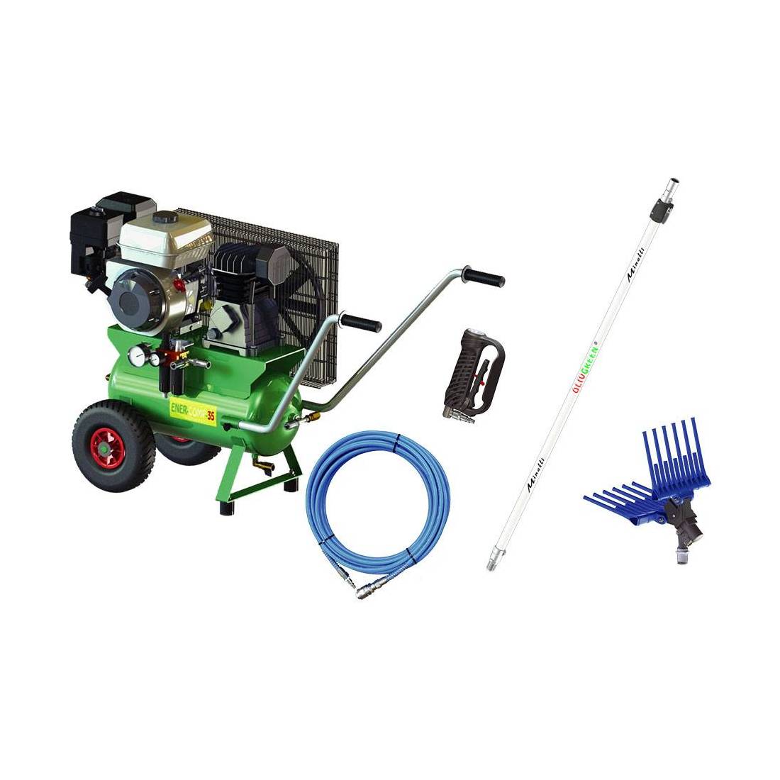 Composizione: 1 compressore carrellato con motore a benzina HONDA GP160 e pompa ABAC PAT24B incluso kit acceleratore automatico e serbatoio monobombola da 24 litri, 1 abbacchiatore pneumatico, 1 tubo poliuretano da 20 metri completo di raccordi rapidi, 1 asta telescopica in alluminio mt. 1,6>3, 1 impugnatura. Portata aria 330 lt/min. Supporta 1 abbacchiatore e 2 forbici.