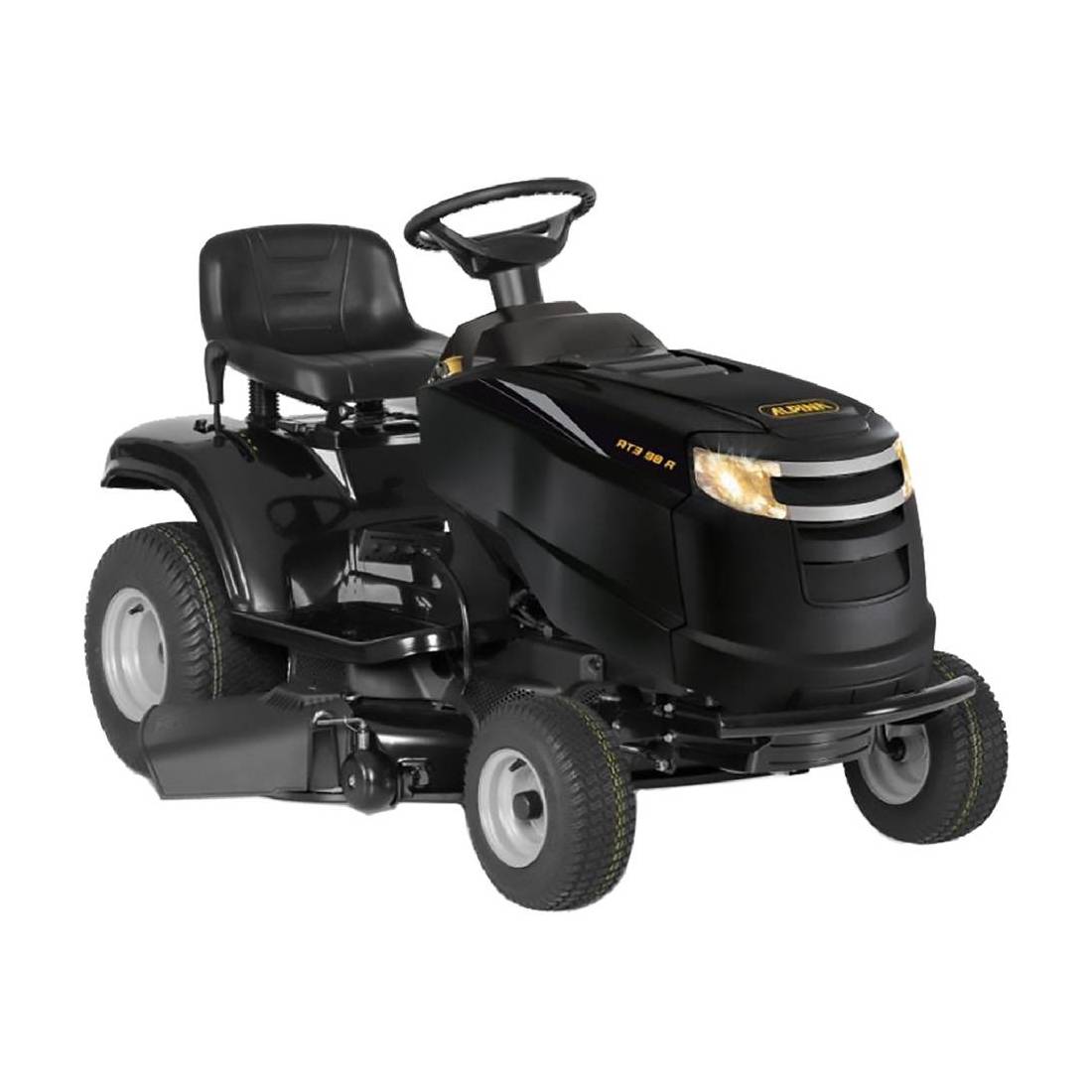 Sistema di taglio a scarico laterale, larghezza di taglio 98 cm. Taglio in retromarcia, rotazione lama asincrono. A 7 posizioni di altezza taglio regolate manualmente con leva (25-80 mm), doppia lama. Motore benzina Alpina OHV 'ST350', raffreddamento ad aria, serbatoio carburante 6 litri, tipo batteria 12V, 18Ah. Trasmissione meccanica. Possibilità di aggiungere come kit opzionale sistema mulching. Per aree di lavoro di massimo 4500 m2.