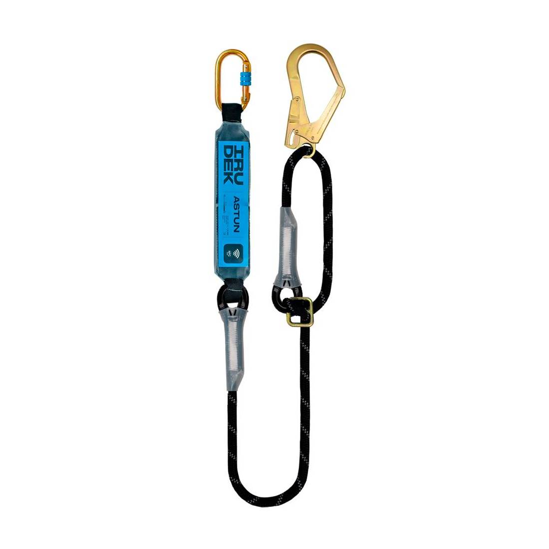 Con un gancio ad apertura 50 mm ed un moschettone. Corda semistatica in poliammide diametro 12 mm. Terminale della corda cucito saldamente e ricoperto in polietilene, redance in PVC resistenti all'abrasione. Resistenza statica 25 kN. Distanza massima di arresto 1 metro. Testato in conformita a norme EN 355, EN362.