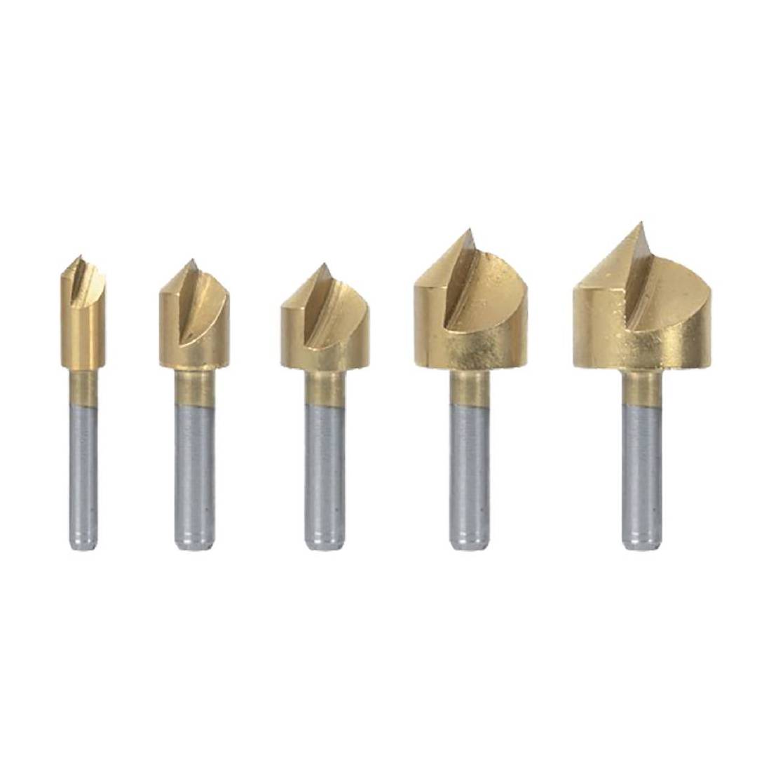 Realizzate in acciaio Hss placcate in titanio. Angolo di testa 90°, adatte per smussare o realizzare impressione di una testa della vite. Utilizzabili su trapano, ideali per lavorare su legno, plastica, alluminio. In cassetta alluminio. Intaglio ø mm 6x60 - 10x67 - 13x80 - 16x85 - 19x85.