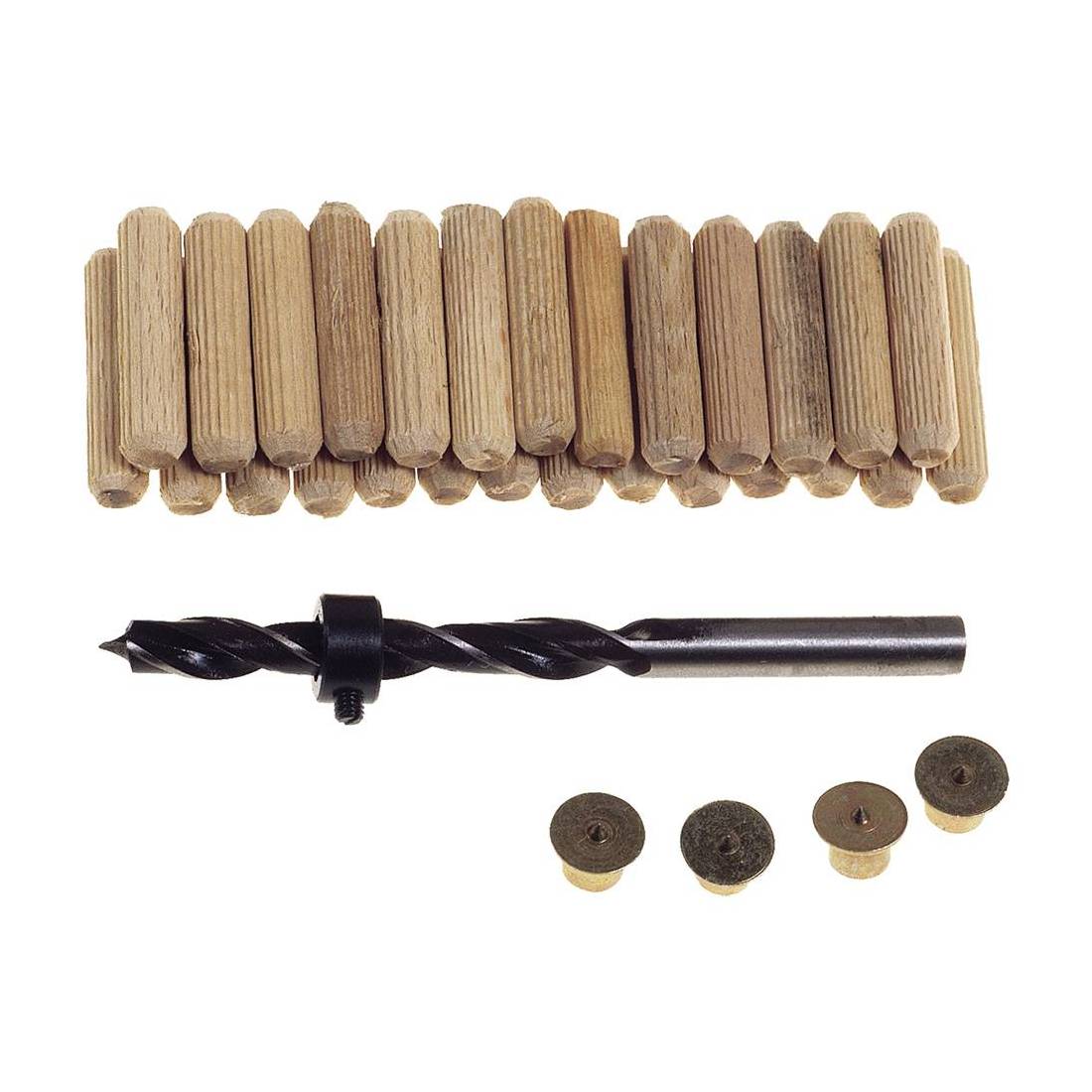 In kit. Completo di 1 punta per trapano con boccola di arresto, 4 spine a centrare e 25 tasselli in legno.