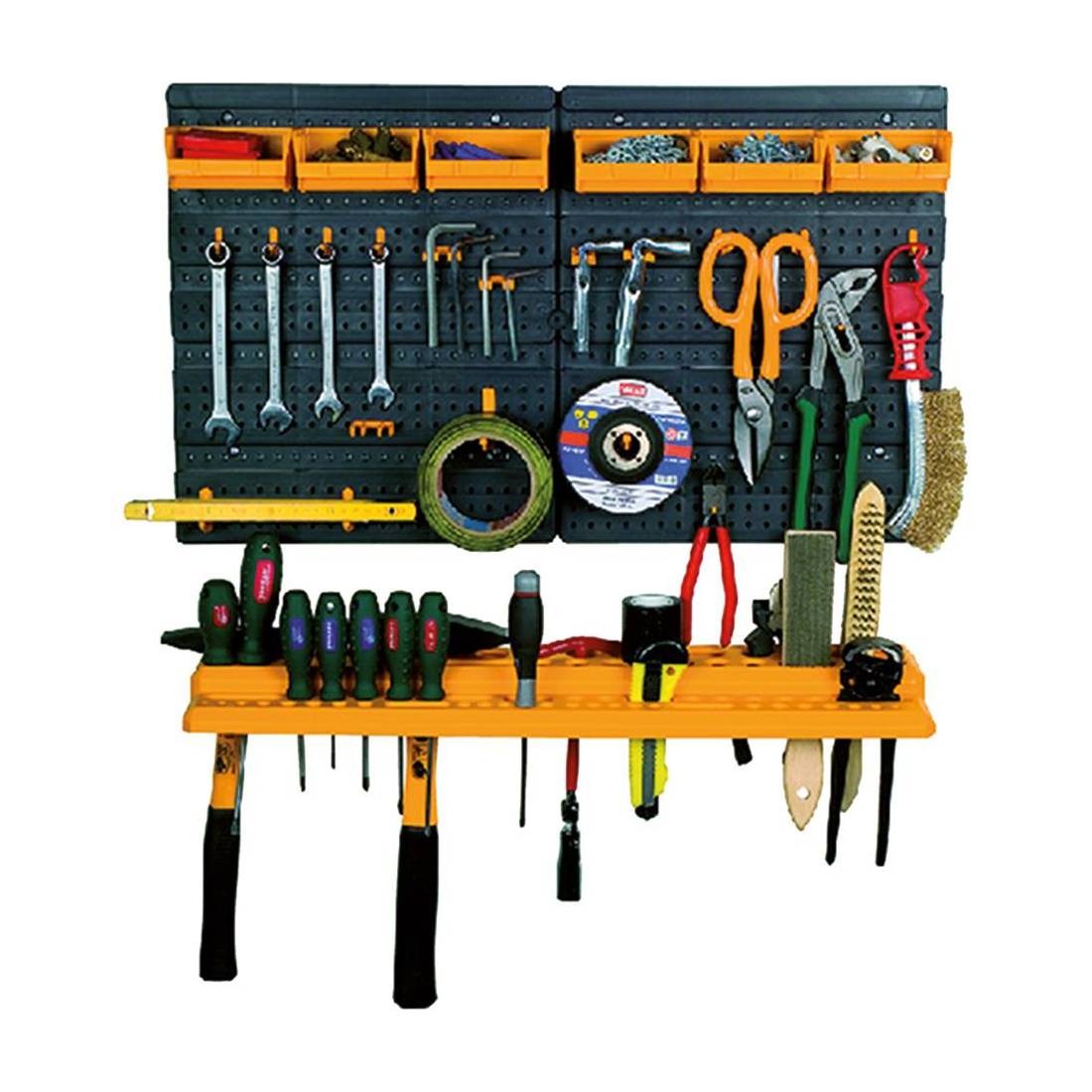 Con mensola porta attrezzi, 6 contenitori e 19 ganci assortiti. In polipropilene. Fornito vuoto.