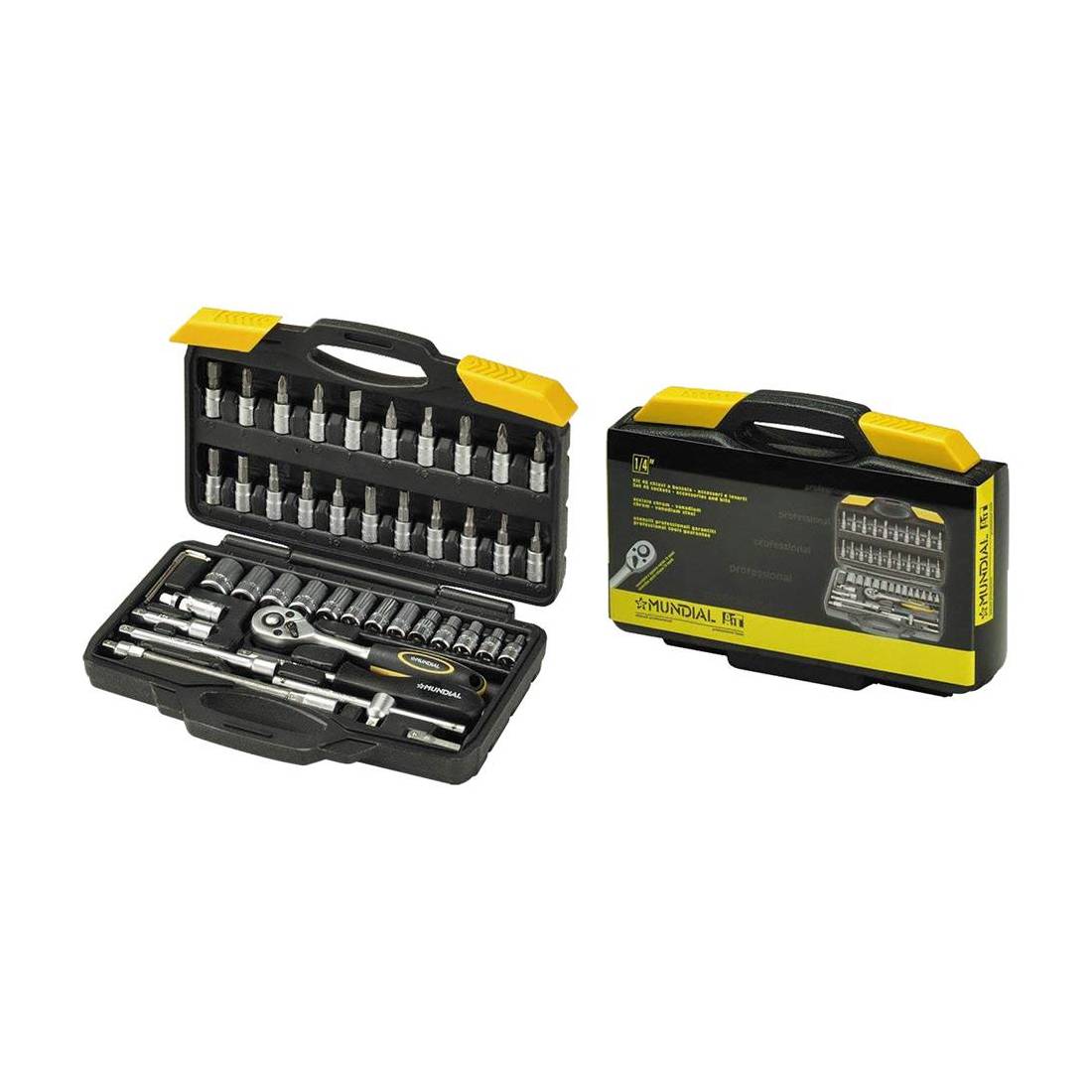 In acciaio attacco da 1/4. Composizione: 13 chiavi bussola 1/4 esagonali 4-4,5-5-5,5-6-7-8-9-10-11-12-13-14 mm, 1 cricchetto reversibile 1/4 mm 140, 2 prolunghe 1/4 acciaio cromo vanadio 75-150 mm, 1 impugnatura porta bussole 1/4, 1 leva a T 1/4, 1 snodo cardanico 1/4, 3 chiavi bussola 1/4 intaglio mm 4-5-6 mm, 3 chiavi bussola 1/4 phillips PH1-PH2-PH3, 3 chiavi bussola 1/4 pozidriv PZ1-PZ2-PZ3, 5 chiavi bussola 1/4 esagonali maschio 3-4-5-6-7 mm, 6 chiavi bussola 1/4 torx con foro TX10-15-20-25-30-40, 4 chiavi maschio esagonali 1,2-1,5-2,0-2,5, 1 adattatore 1/4. In valigetta plastica.