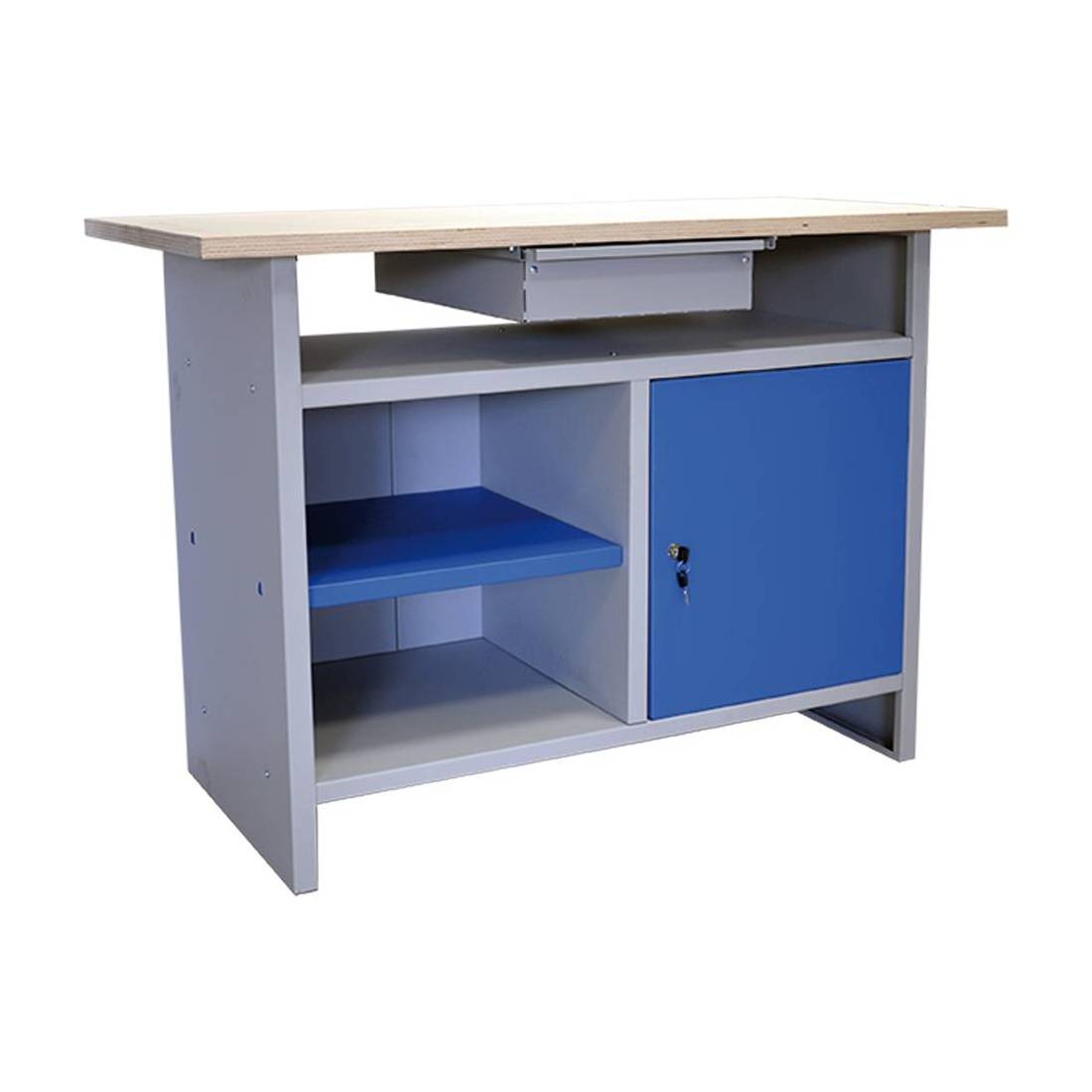 Fornito smontato. Struttura in lamiera verniciata, con piano in legno, 1 ripiano con pianetto e anta richiudibile azzurra, ripiani inferiori e cassetto centrale. E' ideale per officine, garage e laboratori, offrendo una soluzione completa per mantenere l'area di lavoro ordinata con gli strumenti facilmente accessibili.
