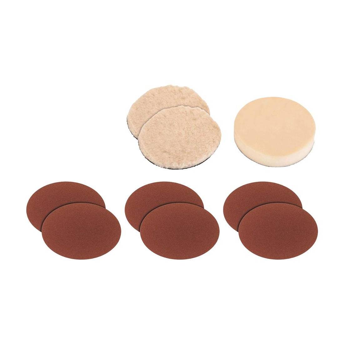 Composizione: 2 cuffie in materiale sintetico per rifinitura, 1 platorello in gomma piuma, 6 pezzi di carta abrasiva (2 da grana 60, 2 da grana 80, 2 da grana 120).