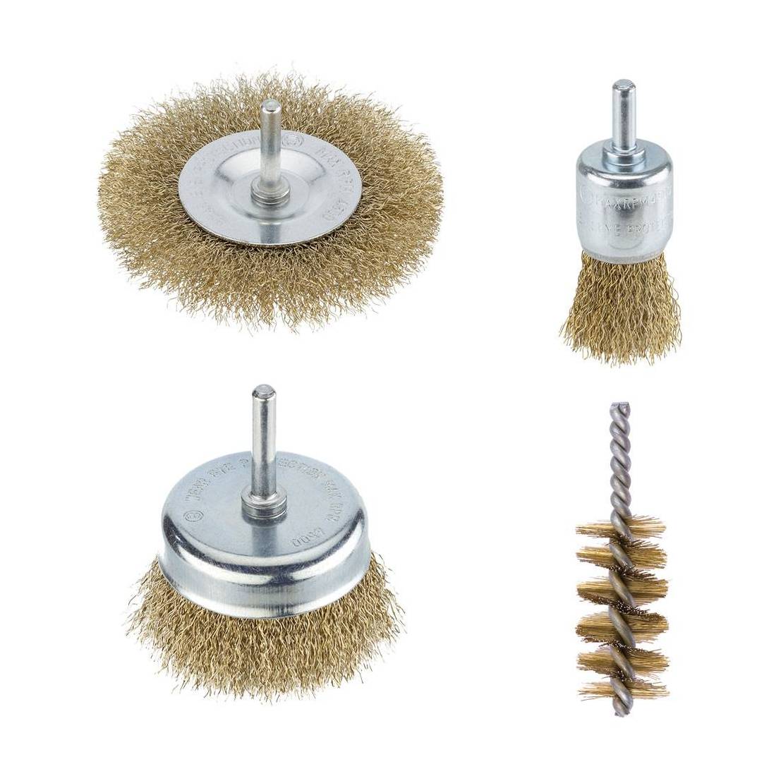 In fili d'acciaio. Composizione: 1 spazzola circolare Ø 75 mm, 1 spazzola a tazza Ø 50 mm, 1 spazzola a pennello Ø 25 mm, 1 spazzola a scovolo da 28 mm. In blister.