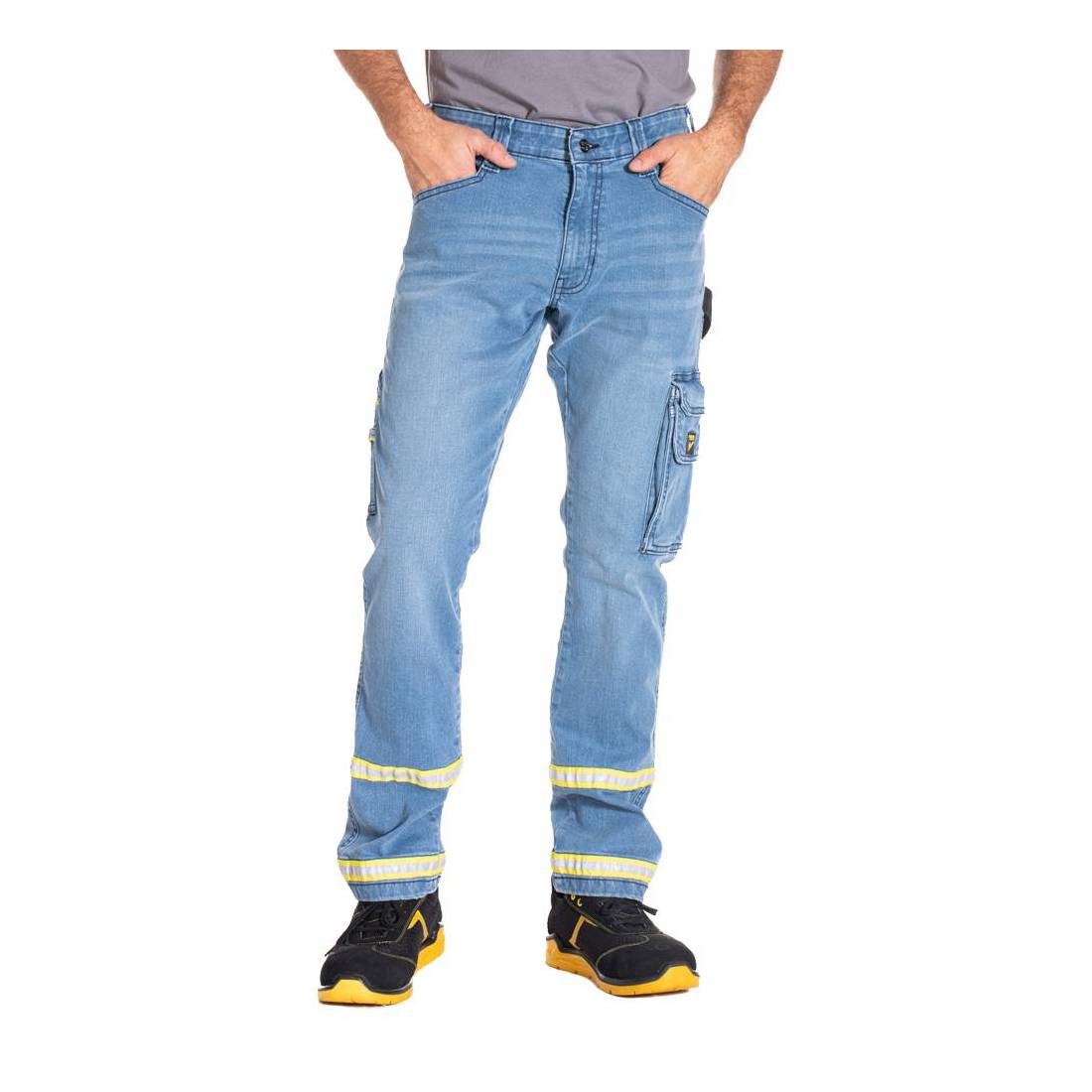 In 98% cotone, 2% elastane. Vita alta, doppia fascia interna in vita con elastico, ampie tasche sul retro, apposizione di strisce riflettenti su tasche, passante, orlo coscia. CE rischi minimi. Chiusura centrale con zip, bottone in vita. Peso 366 gr/mq. Colore blu.