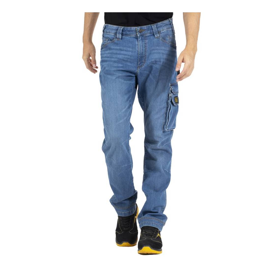 Realizzato in 78% cotone 20% poliestere 2% elastan. Doppia cintura elastica interna per un ottimo sostegno, cavallo rinforzato e tripla cucitura. Tasca laterale con velcro per il cellulare o gli attrezzi e tasca per il righello. Cinghia porta attrezzi. Taglio dritto, passanti XL ultra resistenti, cuciture a barra rinforzate per una resistenza impeccabile. Vita alta, elastico antiscivolo, patta con zip, coscia comfort, denim leggero garzato lavato stretch Fibreflex. Peso 305 gr/mq. Colore blu.