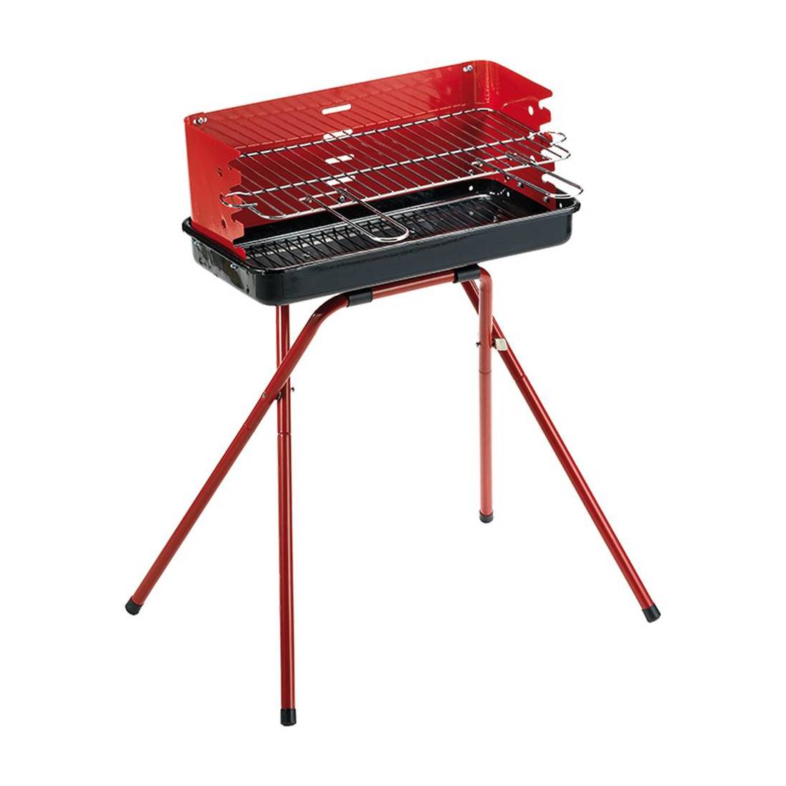 In acciaio verniciato e smaltato. Griglia di cottura in acciaio cromato regolabile in 4 posizioni, certificata per alimenti. Paravento in acciaio verniciato con innesto di sicurezza. Robusto braciere in tondino smaltato. Gambe ad innesto a baionetta.
