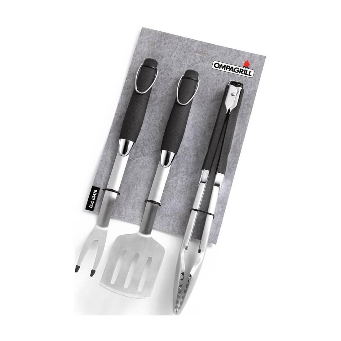 Composto da pinza, paletta e forchettone, e' realizzato in acciaio inox certificato per alimenti da cm 45 con manico antiscivolo.