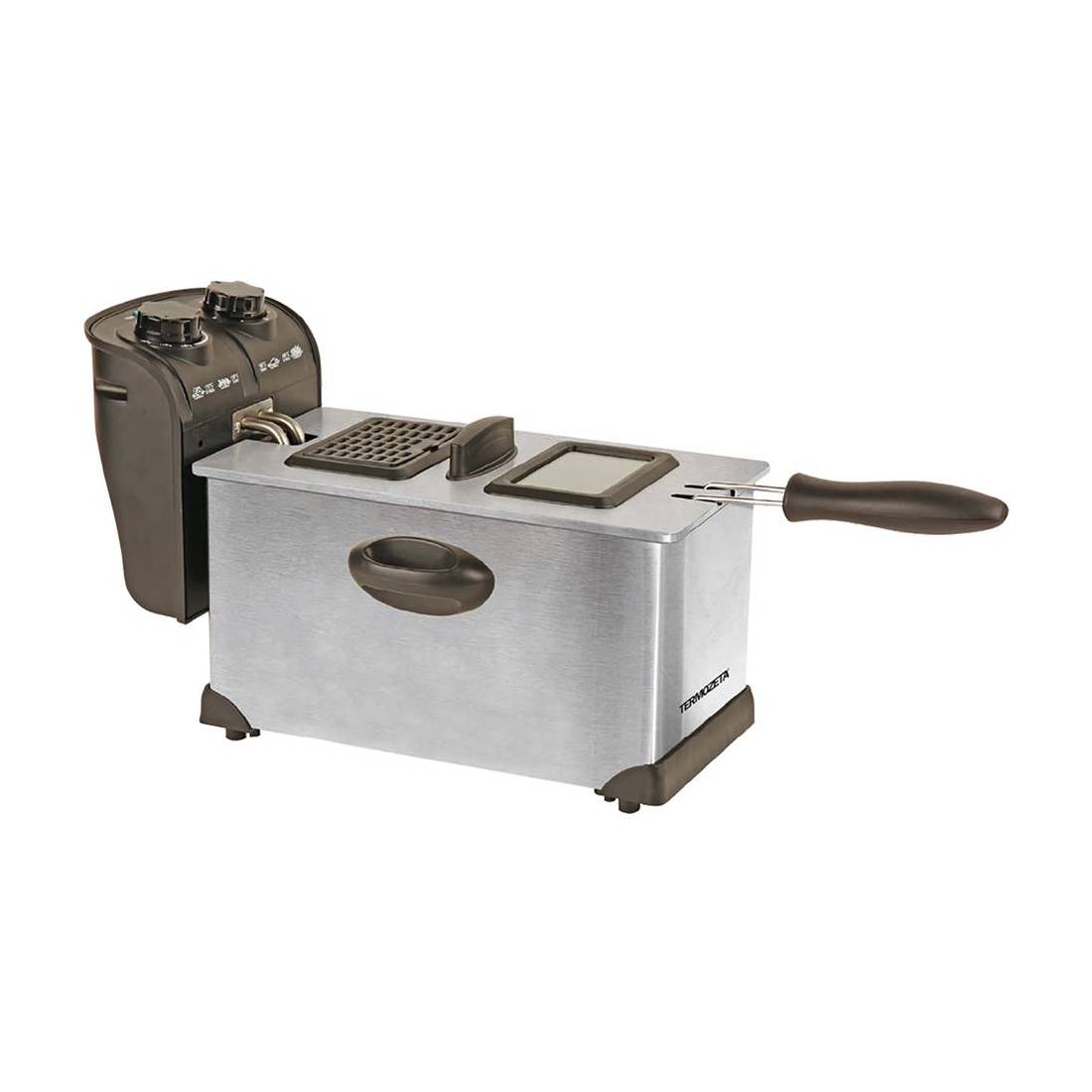 Corpo inox. Ideale per tutti i tipi di frittura. Con vasca amovibile antiaderente estremamente pratica da pulire e serbatoio, cestello e coperchio lavabili in lavastoviglie. Capacità olio 3 lt, oblò per verificare la cottura, pareti fredde. Filtro assorbi odori sul coperchio, timer di cottura regolabile da 0 a 30 minuti, temperatura regolabile da 130° a 190°. Alimentazione: 220/240V-50Hz.
