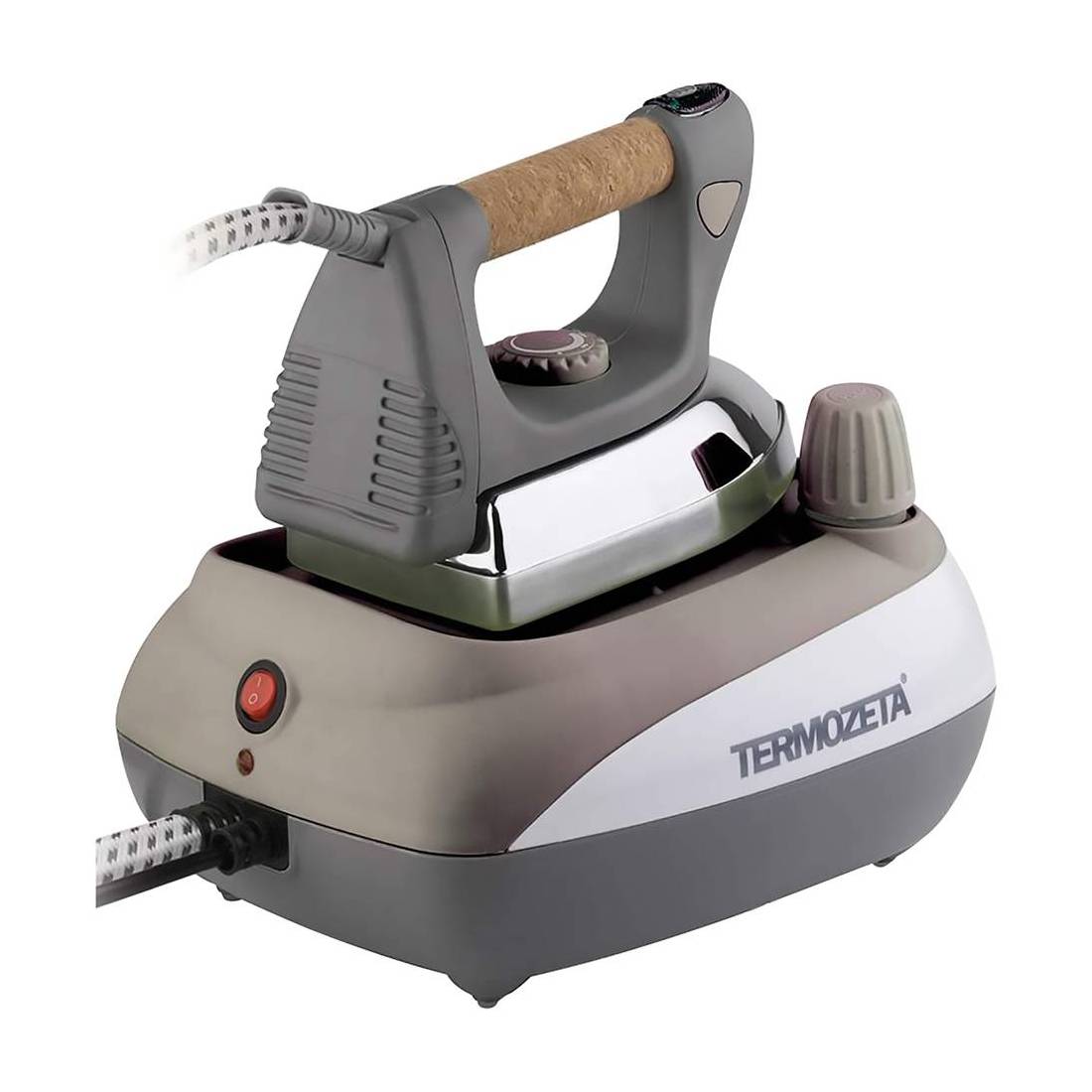 Manico rivestito in sughero. Piastra in alluminio, caldaia in acciaio separata con rivestimento. Regolazione temperatura, tasto erogazione vapore, tasto antisvitamento con dispositivo di sicurezza. Tasto erogazione vapore e funzione vapore continuo. Barre poggia ferro antiscivolo. Pressione 3,5 bar. Spia luminosa pronto vapore e fine acqua. Serbatoio caldaia da ml.600. Alimentazione 230V-50Hz. Potenza ferro 800W - potenza caldaia 1200W.