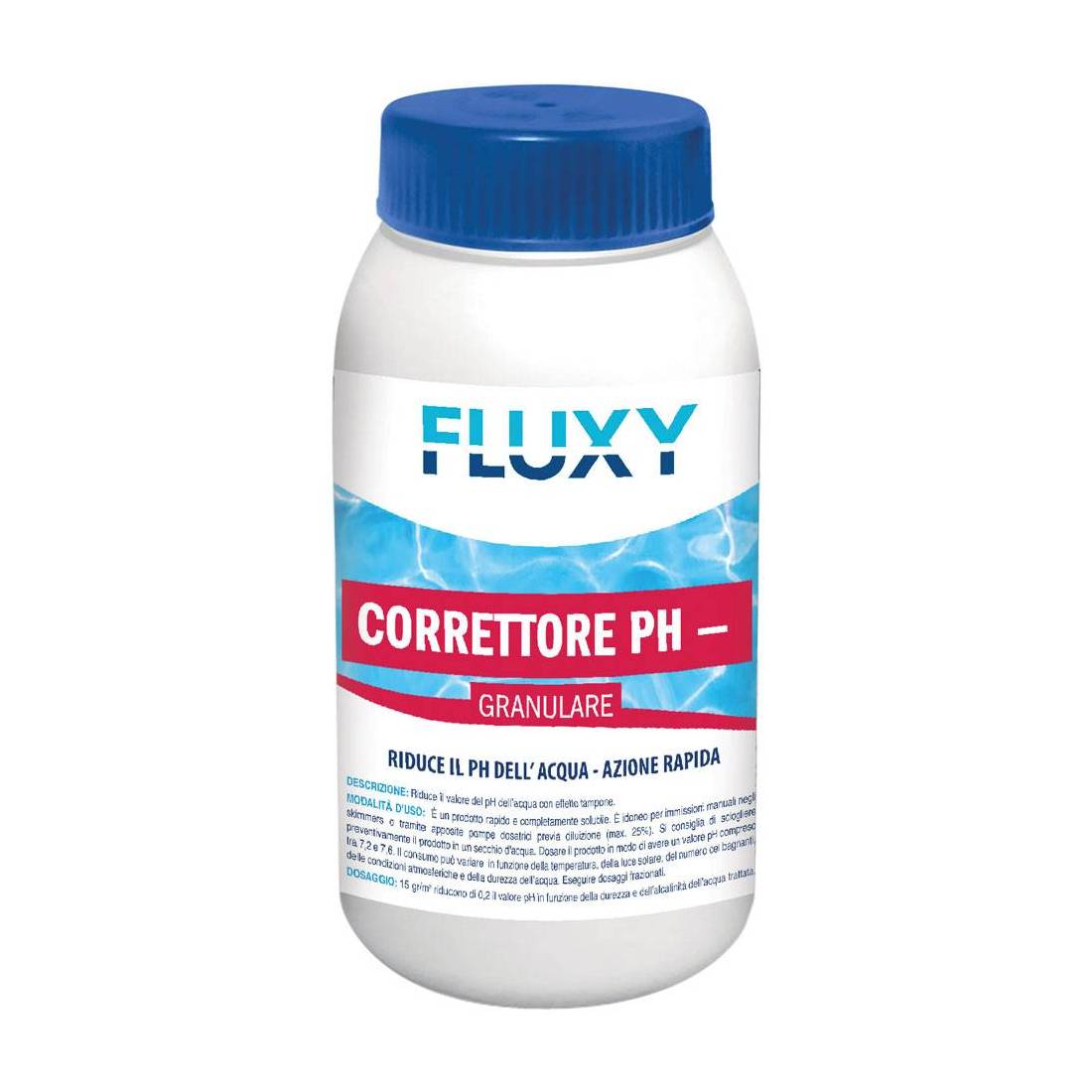 Con bisolfato di sodio. Utilizzato per ristabilire i livelli di pH con effetto tampone. Dosaggio: 5/10 gr per m3 di acqua riducono di circa 0,1 il valore pH in funzione della durezza e dell'alcalinità dell'acqua trattata.