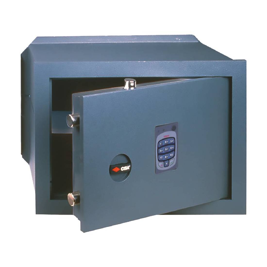 Combinatore elettronico con tastiera alfanumerica retroilluminata. Luce interna, anta smontabile, segnalazioni acustiche e visive. Catenacci girevoli in acciaio nichelato Ø 22 mm. Speciale verniciatura a forno ad alta resistenza contro la corrosione. Piastra di protezione della serratura in acciaio carbonitrurato, serratura a meccanismi fissati direttamente sullo sportello della cassaforte. Assembalggio dei componenti di tenuta con saldature robitizzate. Dimensioni (LxHxP).