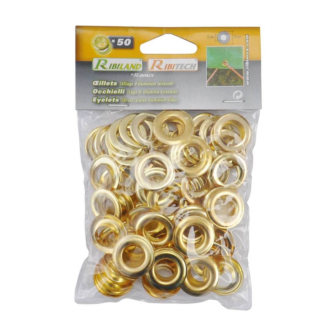 In lega d'alluminio ottonato: Ø interno mm 12, esterno mm 25. Adatti per l'applicazione su qualsiasi tipo di telone o tela. In busta.