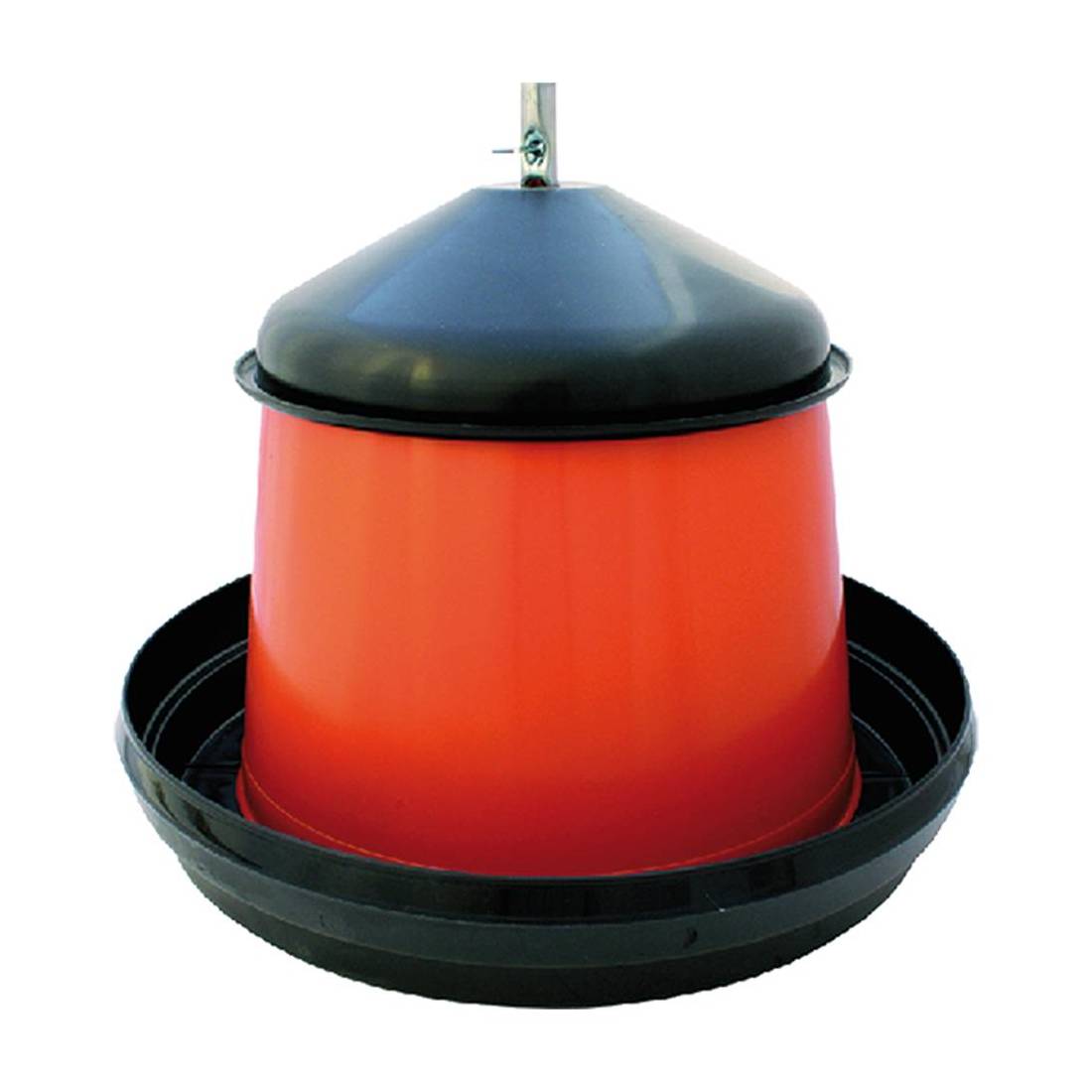 In plastica. Fondo con bordo antispreco e serbatoio conico regolabile per dosare la caduta del mangime.