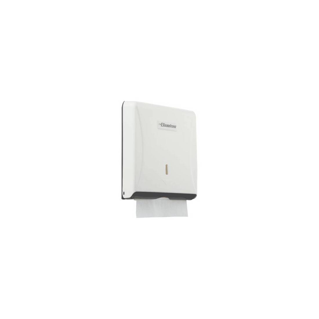 In ABS, colore bianco. Per carta asciugamani piegata a C, V o a Z. Capacità massima 350 fogli. Dotato di finestrella trasparente per controllo livello. Dimensioni: 270x122x273 mm. Compreso di fissaggi.(DianFlex)