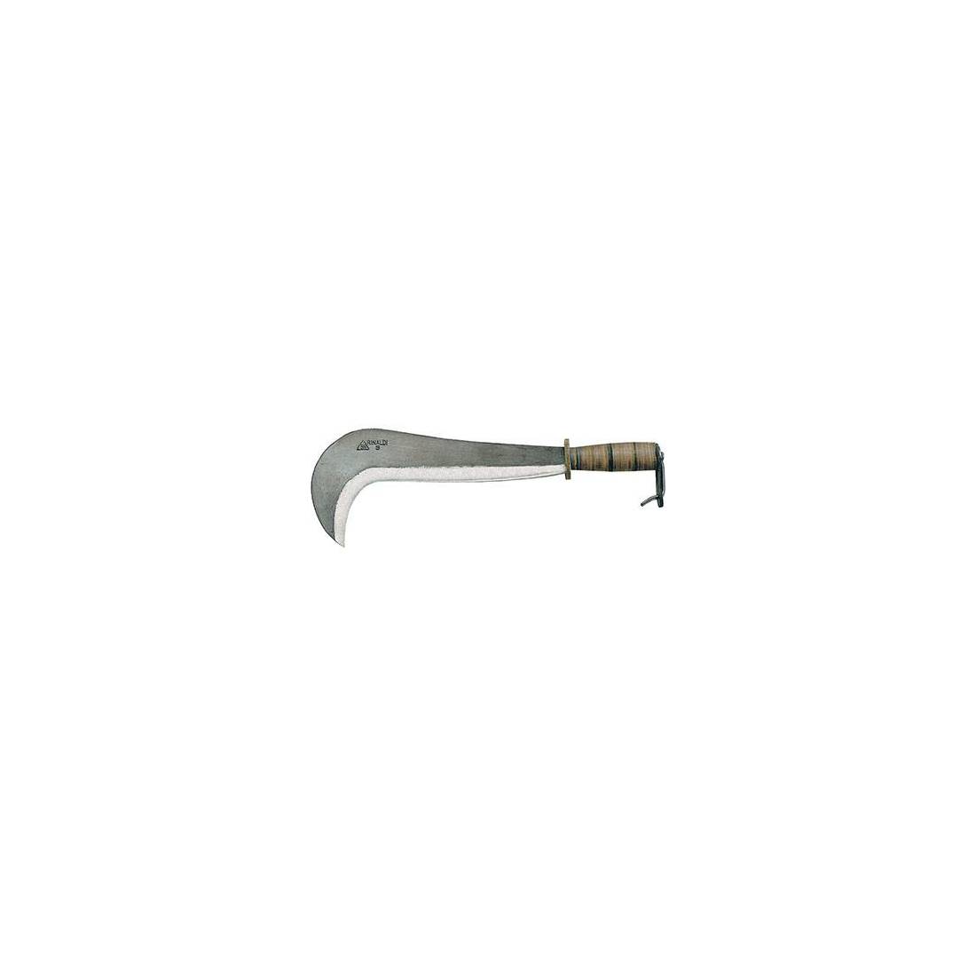 In acciaio forgiato e temperato. Manico in cuoio con gancio.