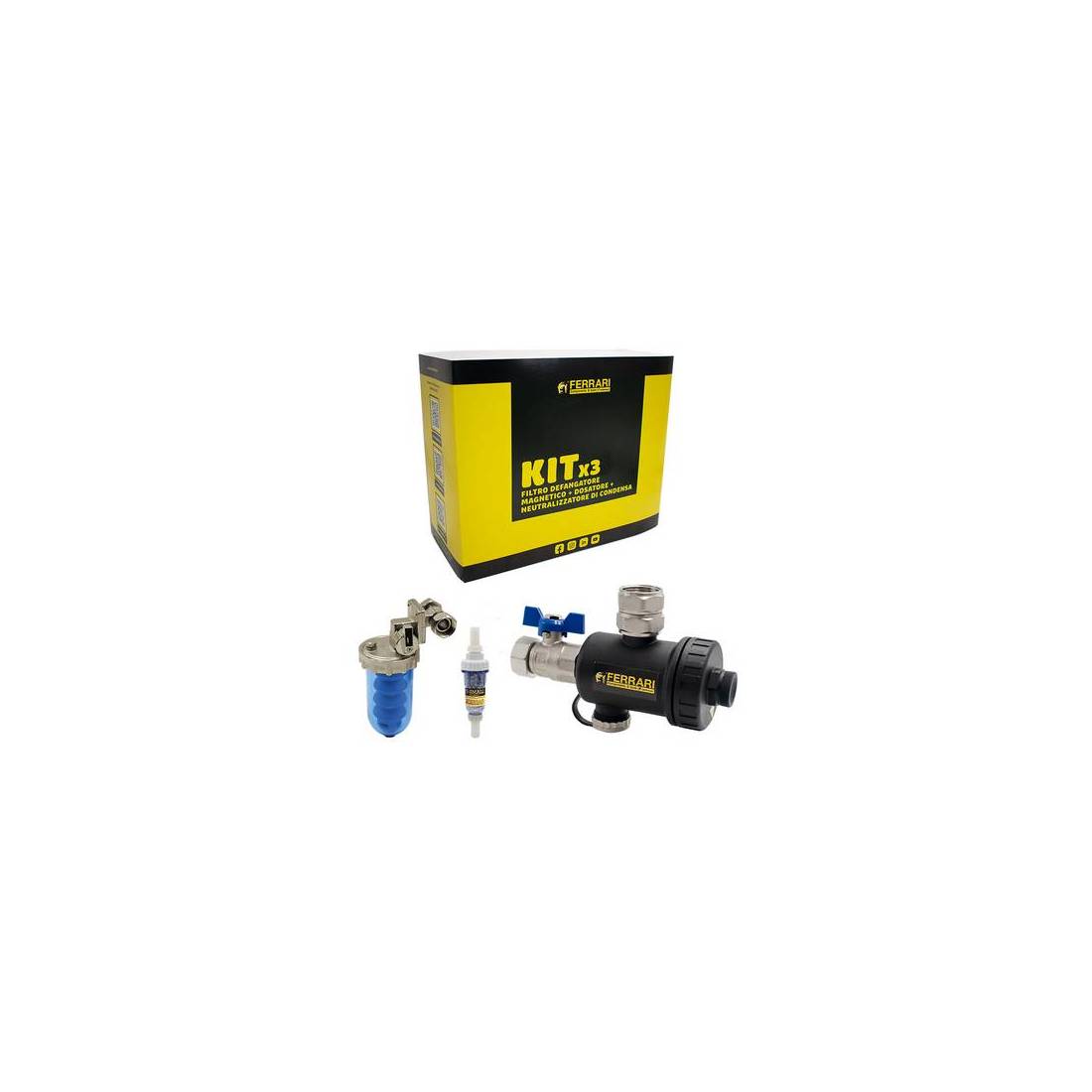 Il kit è composto da: 1 Defangatore MagBlack; 1 Dosafer dosatore di polifosfati con by pass e ghiera ruotante in orizzontale e verticale completo di una cartuccia da 80g certificata Food Grade uso alimentare; 1 neutralizzatore di condensa acida F3 piccolo fornito completo di raccordi portagomma dritti e curvi e ricarica granulare.(DianFlex)