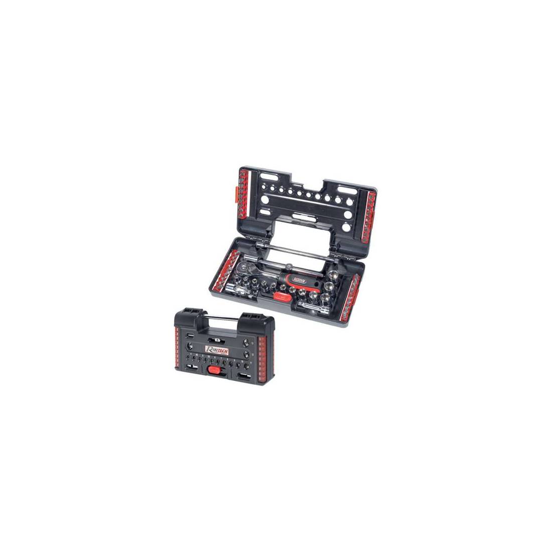 Chiavi a bussola in valigetta 57 pezzi. Il cofanetto comprende: 1 chiave a cricchetto reversibile 1/4" 45 denti. - 12 bussole - 1 snodo cardanico - Prolunga L. 50 mm - Prolunga L. 150 mm. Leva a T e 3 chiavi Allen: 1,5-2-2,5 mm. Porta inserti e 36 inserti 25 mm : 8 per viti a taglio, 7 Phillips, 7 Pozidriv, 4 esagonali, 6 Torx, 4 quadrate.(DianFlex)