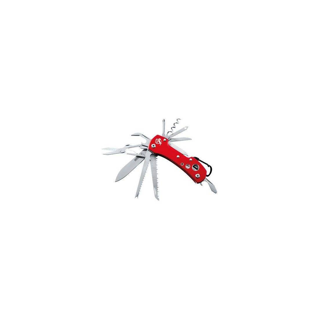 Manico in alluminio anodizzato. 15 funzioni: coltello, sega, squama pesce, dispositivo di rimozione gancio, apriscatole, forbici, apribottiglie, cacciavite sagomato, cacciavite a croce, punteruolo per cuoio, cavatappi, pulisci unghie, lima per unghie, ago e moschettone.
