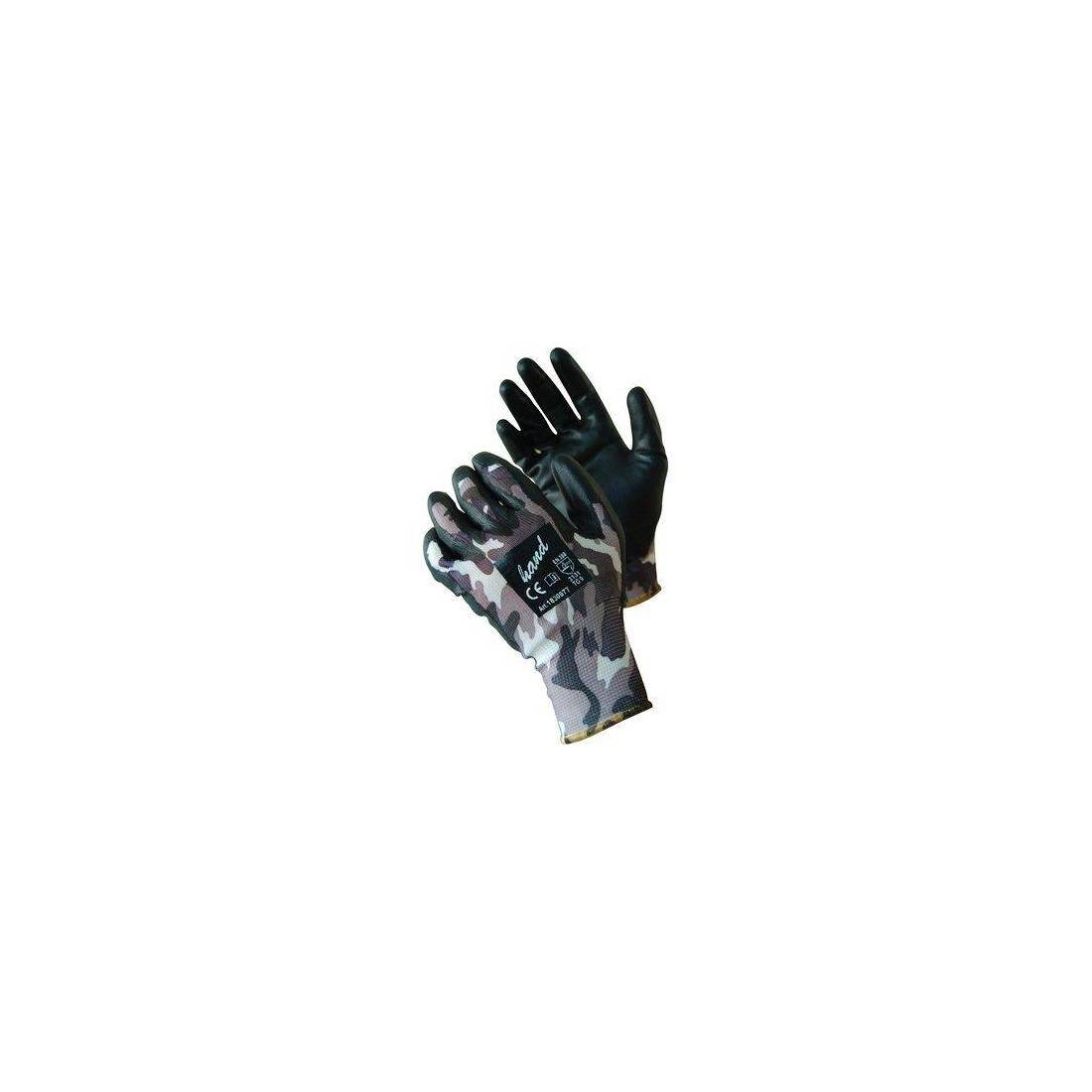 In maglia di nylon a filo continuo, con colore camouflage, spalmatura in poliuretano nero sul palmo e polsino elastico. Alta sensibilità, resistenza all\'abrasione ed allo strappo. Ideale per lavori delicati e di precisione. Dispositivo di protezione individuale (DPI), categoria 2. Protezione contro i rischi meccanici conforme alla normativa EN388, con livelli 3131.