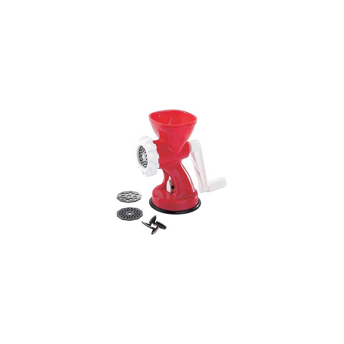In polipropilene per uso alimentare. Con 3 dischi carne in acciaio carbonitrurato e rettificati ed 1 coltello in acciaio inox temperato e rettificato. Ventosa in gomma caucciù. Movimenti del gruppo ventosa in poliammide 66. Facilmente smontabile per una accurata pulizia. Lavabile in lavastoviglie.