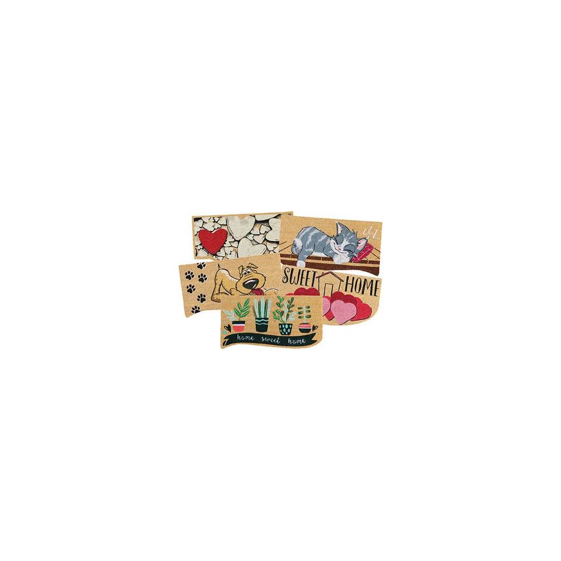 Superficie in cocco tuftato con fibra 100% naturale con fondo in PVC. Stampa con colori acrilici a base acqua. Ottima resistenza del colore e brillantezza. Forma sagomata. Spessore Mm. 14. Fantasie assortite.