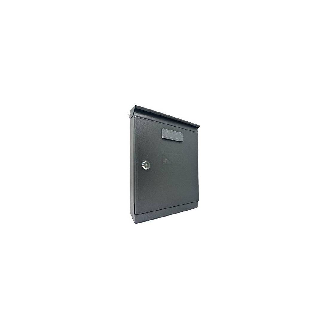 In lamiera verniciata. Colore antracite. Con apertura tetto e frontale. Serratura a cilindro con doppia chiave. Con portanome in plastica trasparente.