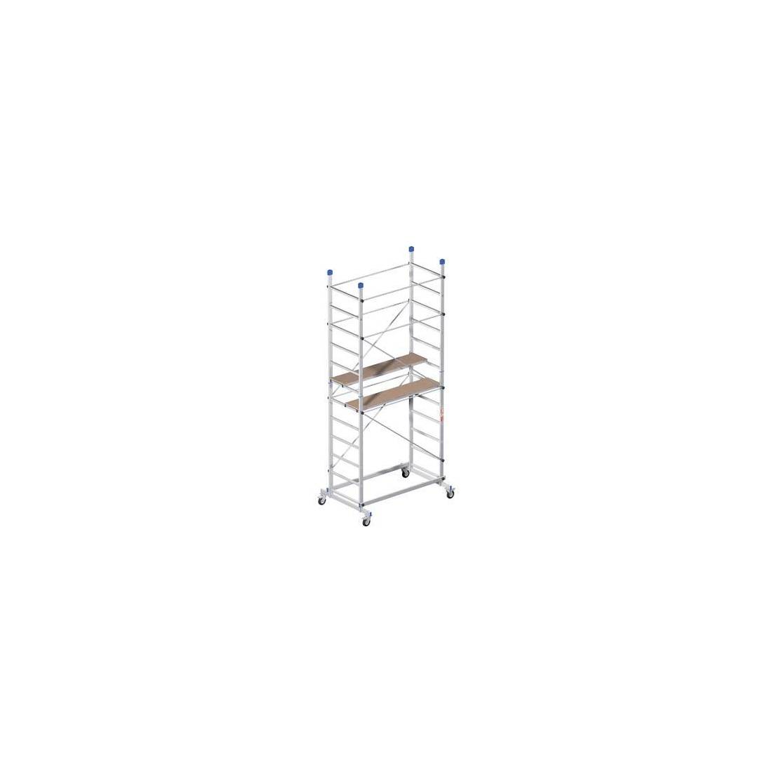 Con struttura in alluminio, montanti con sezione Mm. 60x25. Montaggio veloce grazie al sistema esclusivo di innesto rapido della torre. Con due semipiani in legno e 4 ruote da Mm. 100 di diametro con freno. Aste di connessione con pomi di sicurezza. Struttura del piano di lavoro in acciaio zincato. Base allargata da Mt. 1,57x1, per una maggiore stabilità. Larghezza montante Cm. 70 altezza Mt. 3,60. Altezza massima piano Cm. 1,98. Altezza massima raggiungibile dall\'operatore Mt. 3,98. Portata massima Kg. 150. Peso kg. 43,50. Conforme al D.Lgs.206/2005, Art. 2 consumatori ed al D.Lgs. 81/2008, Art. 140.