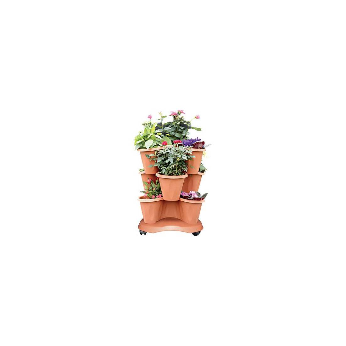 In polipropilene. Colore terracotta. Innovativo vaso sovrapponibile, permette la composizione di piante su più livelli. Resistente agli sbalzi di temperatura, agli urti e ai raggi solari. Garantito 3 anni. In confezione da 3 vasi sovrapponibili, completo di sottovaso con ruote. Capacità Lt. 18.
