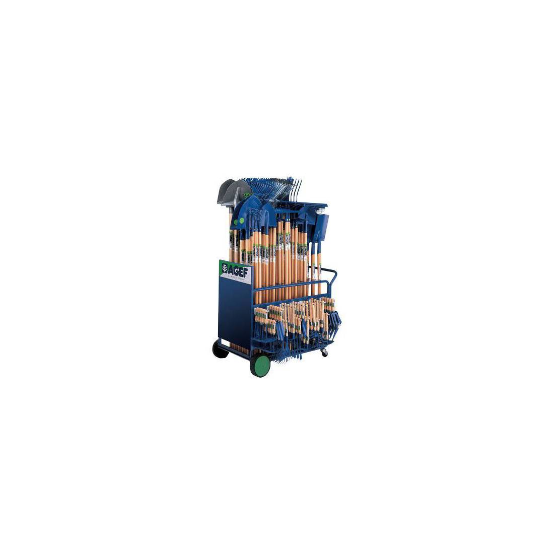 In metallo verniciato con ruote e maniglia, composto da: 5 badili, 3 estirpatori, 3 ragni, 30 rastrelli, 9 rastrellini, 5 rastrelloni, 5 sarchiatori, 3 scopette, 6 trapiantatori, 20 vanghe e vanghetti e 22 zappette.