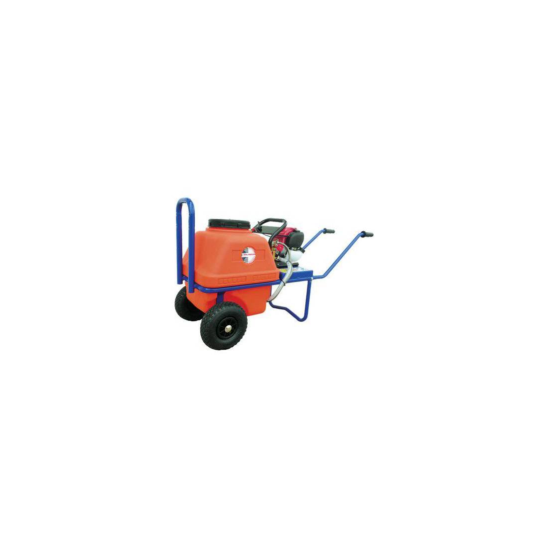 Carrello con motopompa e serbatorio in polipropilene, completo di coperchio superiore a vite e tappo di scarico inferiore. Bocca di riempimento con filtro a tazza per setaccio impurità. Robusta struttura tubolare in acciaio verniciato. Manici estraibili con impugnatura. Motopompa con motore a scoppio P768 SC4 (Art. 64.306.81). In dotazione: tubo di aspirazione con filtro da Mt. 1,20, tubo di scarico da Mt. 1,50, lancia da Cm. 60 regolabile a manopola e tubo ad alta pressione da Mt. 5.