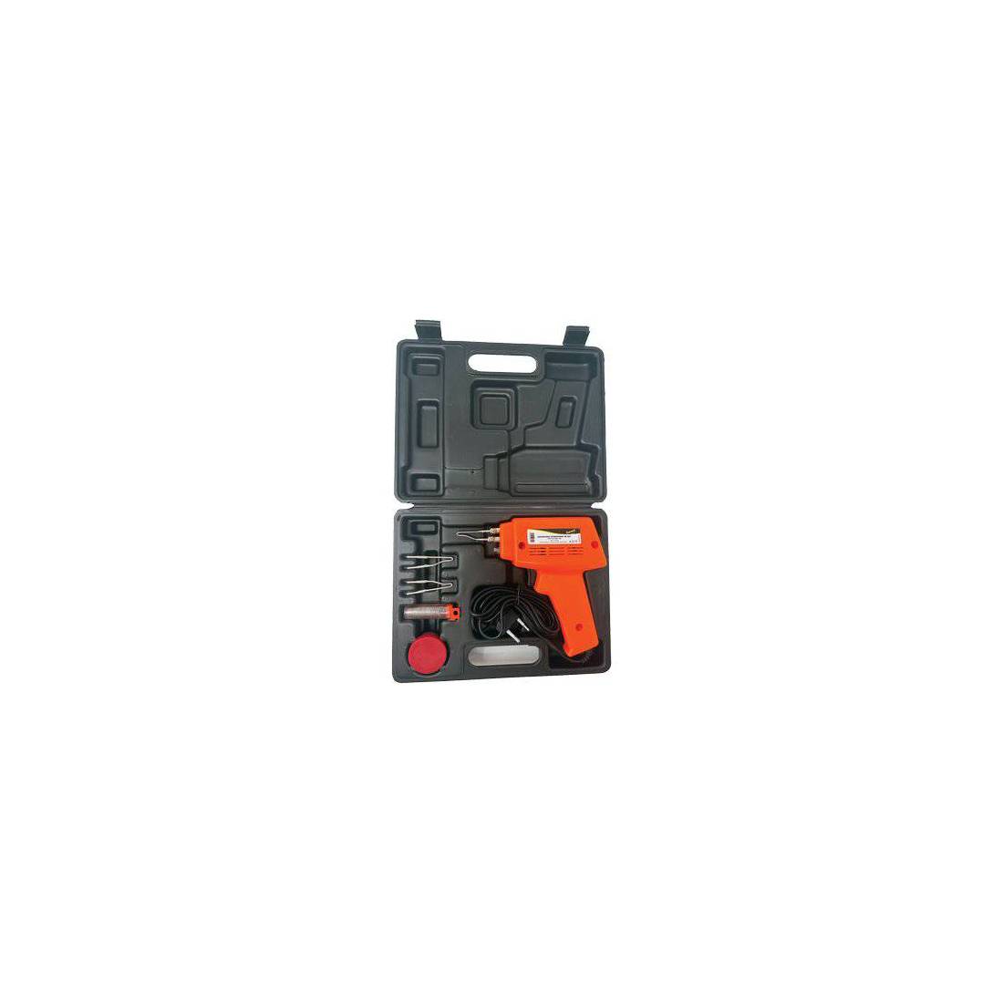 Con impugnatura anatomica e luce led. Alimentazione Volt 220. In dotazione: valigetta in plastica, 3 punte per saldatura, stagno e pasta per saldare.
