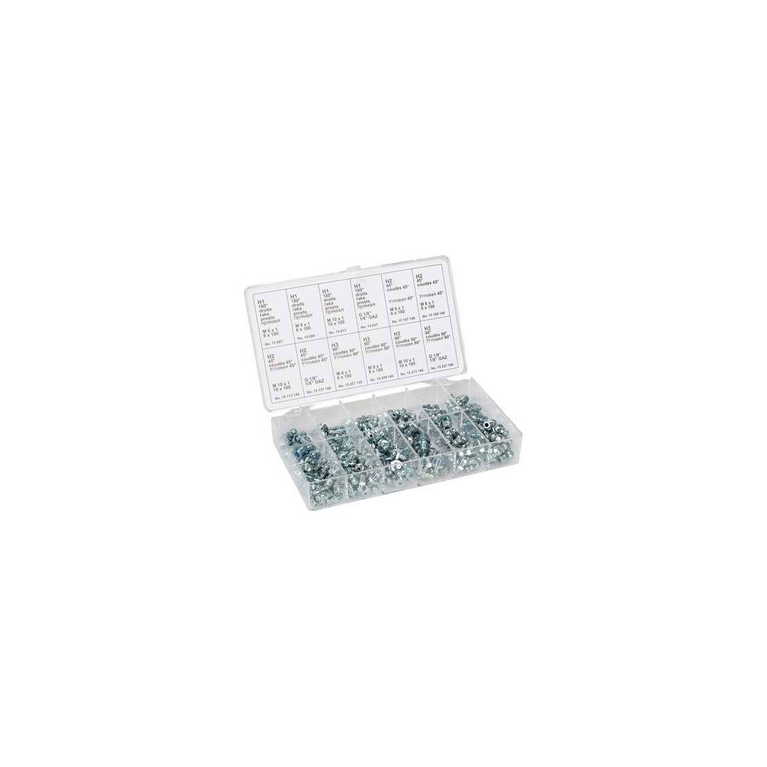 Cassetta in plastica con testine per ingrassatori in acciaio DIN 71 412. Temperate e zincate, con base esagonale. Contenente 140 testine assortite tra tipologie H1, H2 e H3.