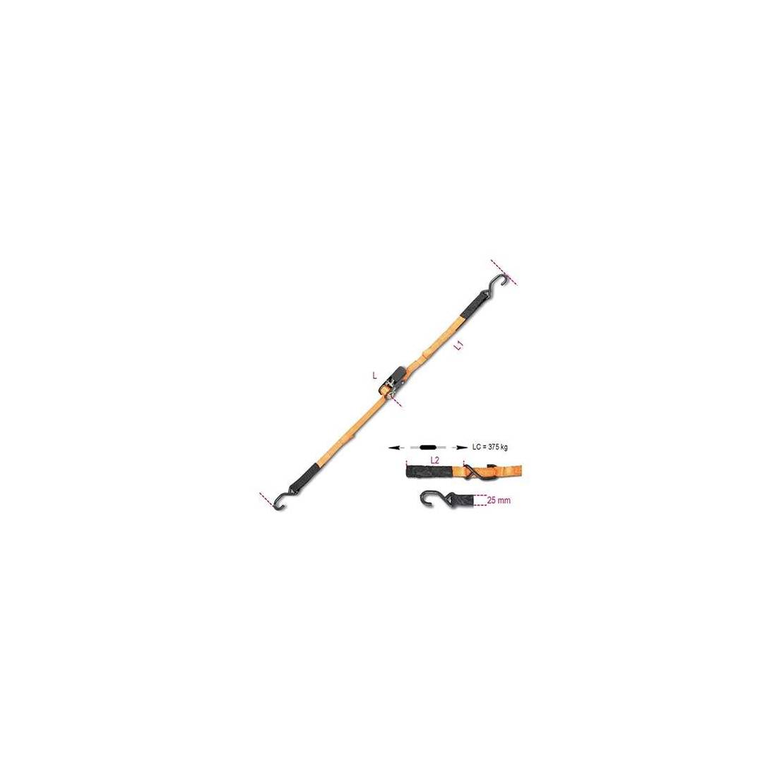 Sistema di ancoraggio a cricchetto, nastro in poliestere ad alta tenacità, con occhiolo per ricovero ganci. Ganci ad uncino rivestiti in PVC. Rispondente alla normativa EN 12195-2. Larghezza Mm. 25. Capacità massima Kg. 400.