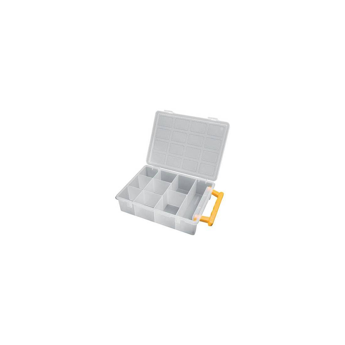 In polipropilene trasparente antiurto. Coperchio a chiusura ermetica. Separatori fissi che organizzano lo spazio interno. Con maniglia per il trasporto.