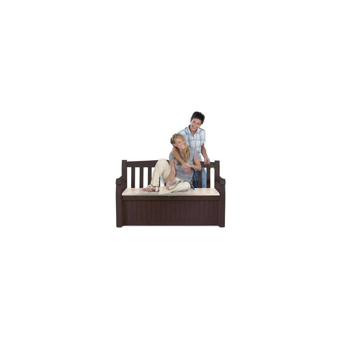 In resina a due posti con schienale, di colore marrone. Con predisposizione per lucchetto.