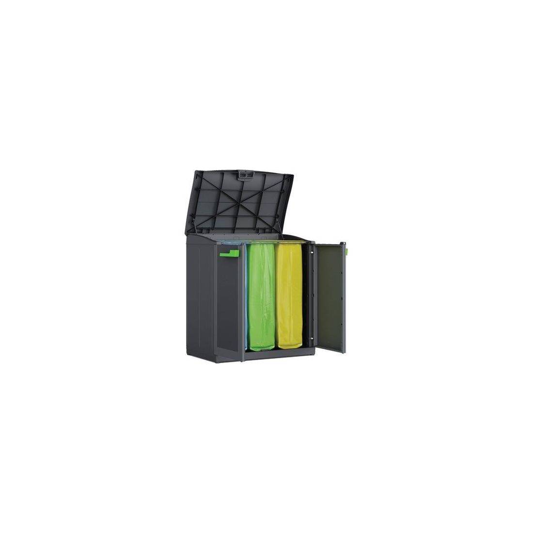 In plastica resistente di colore grigio. Con 2 ante frontali e 1 coperchio superiore. Con cerniere in metallo. Ideato per la raccolta differenziata. Completo di 2 maniglie verdi e due maniglie grigie. Porta 3 sacchi da Lt. 110.
