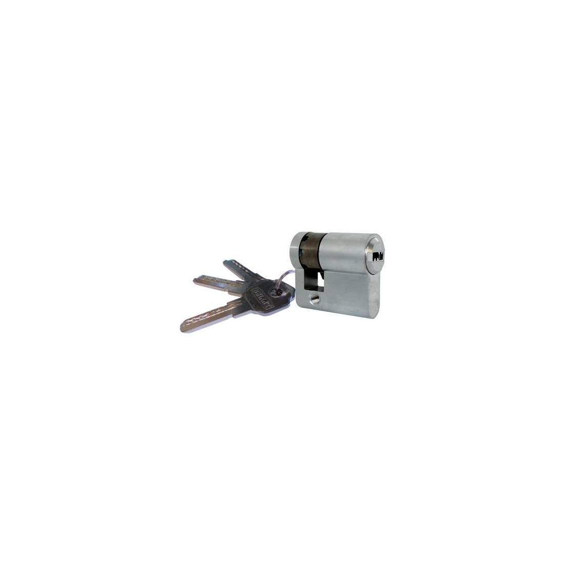 In ottone cromato satinato. Fornito con 3 chiavi punzonate e vite di fissaggio.