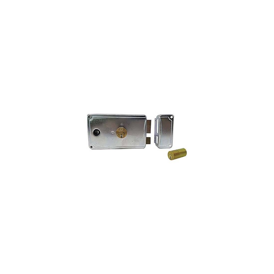 Con doppio cilindro fisso interno ed esterno Mm. 50. Scrocco. Chiusura con catenaccio a 3 mandate. Quadro maniglia Mm. 8. Altezza scatola e bocchetta Mm. 85. In acciaio zincato. In dotazione: 3 chiavi piatte, 1 bocchetta e 1 borchia.