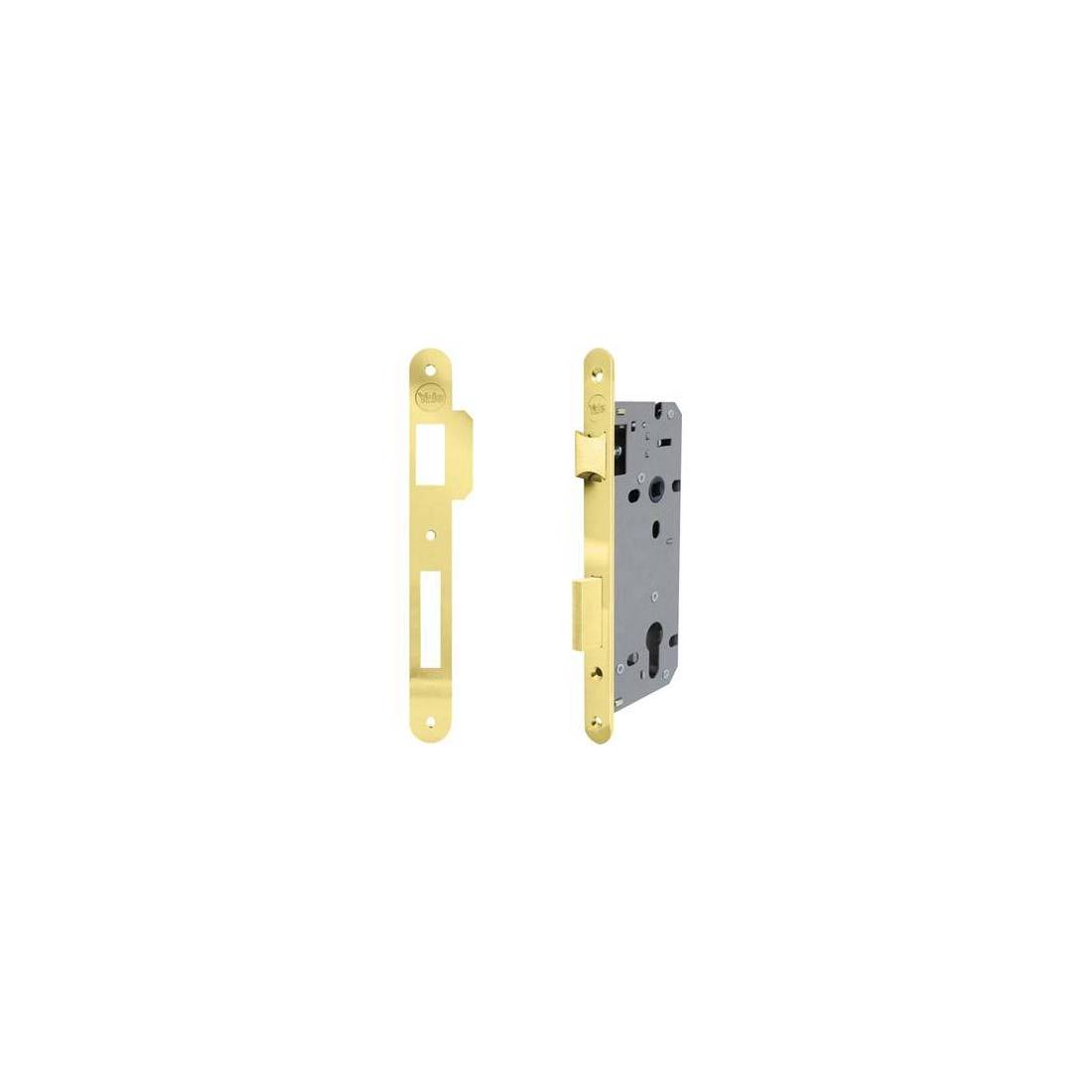 Per cilindro sagomato. Scrocco reversibile. Chiusura con catenaccio a 2 mandate. Quadro maniglia Mm. 8. Frontale con bordo quadro da Mm. 22x238. Altezza scatola Mm. 170. In dotazione: 1 contropiastra in acciaio con aletta.