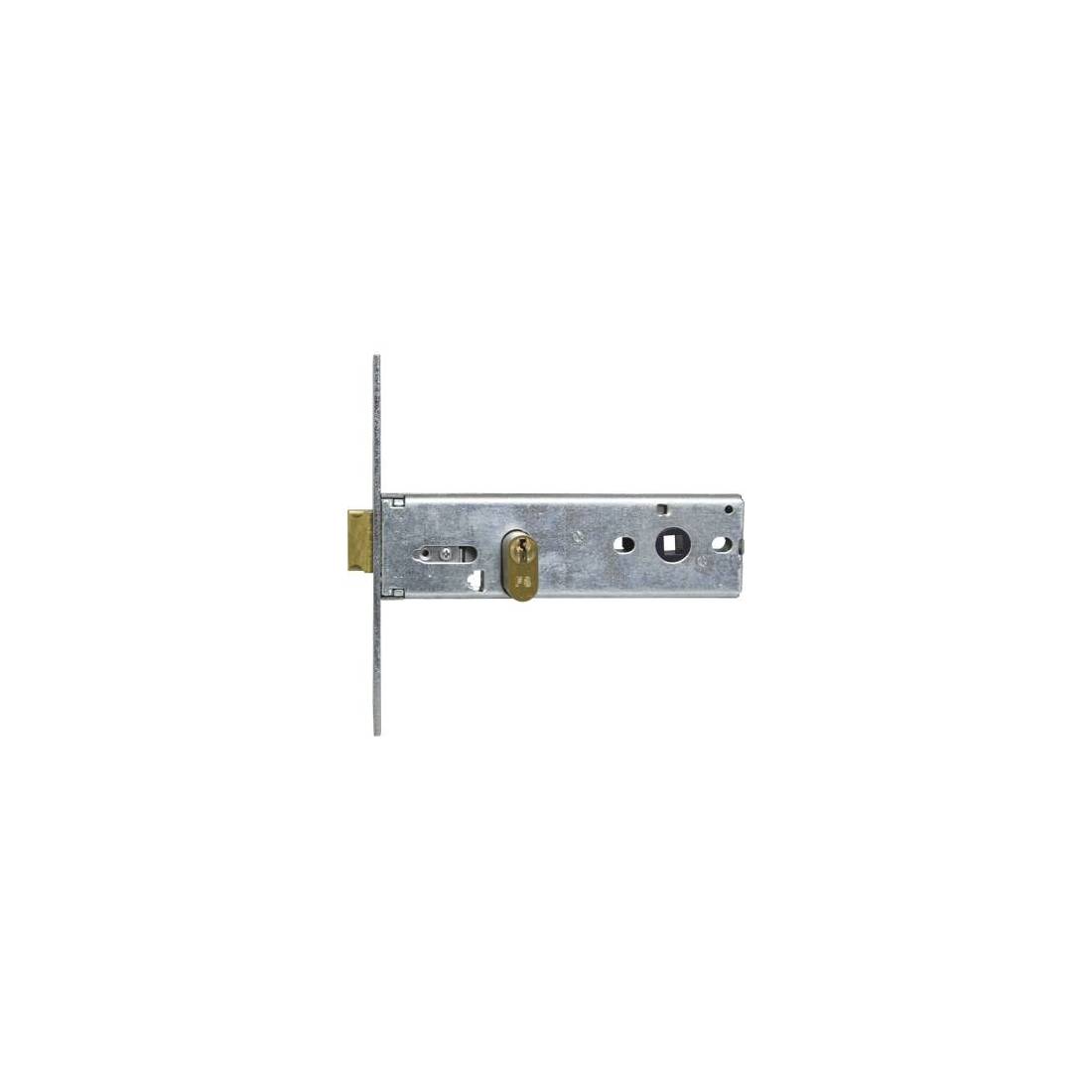 Con cilindro ovale. Scrocco reversibile con catenaccio incorporato. Chiusura da Mm. 9. Quadro maniglia Mm. 8. Frontale in acciaio zincato con bordo quadro da Mm. 20x160. Altezza scatola Mm. 44. In dotazione: vite di fissaggio cilindro e 3 chiavi piatte.