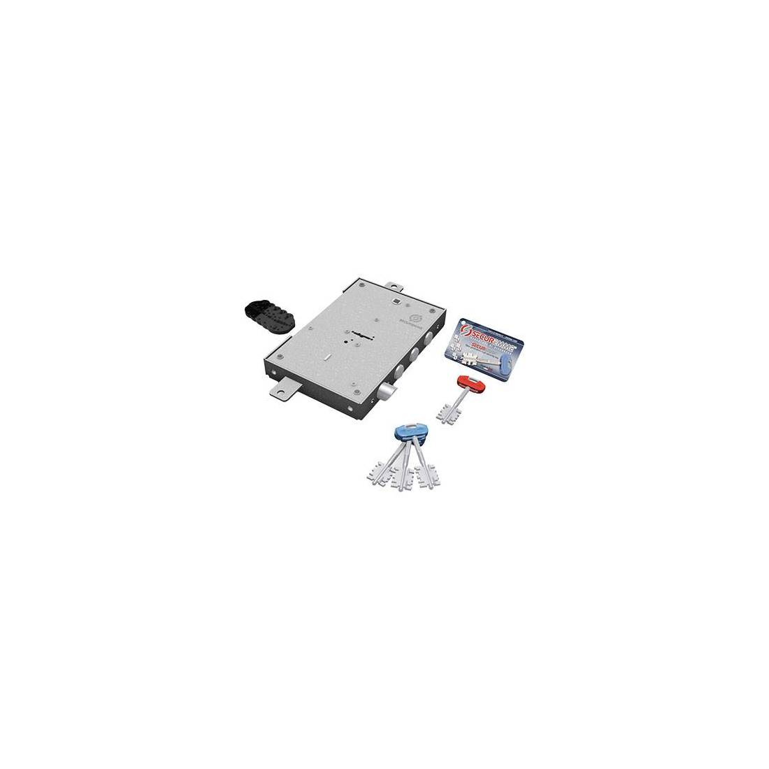 A doppia mappa a duplicazione protetta Securmap 24. Scrocco reversibile, azionabile da chiave o maniglia. Chiusura triplice con catenaccio a pistoni e 4 mandate, sporgenza Mm. 3 e corsa Mm. 40, e predisposizione per fissaggio aste, corsa Mm. 20. Quadro maniglia Mm. 8, interasse Mm. 85. Scatola Mm. 136x206. In acciaio zincato. In dotazione: 3 chiavi e 1 chiave di servizio. Compatibile 52571/28 Mottura.