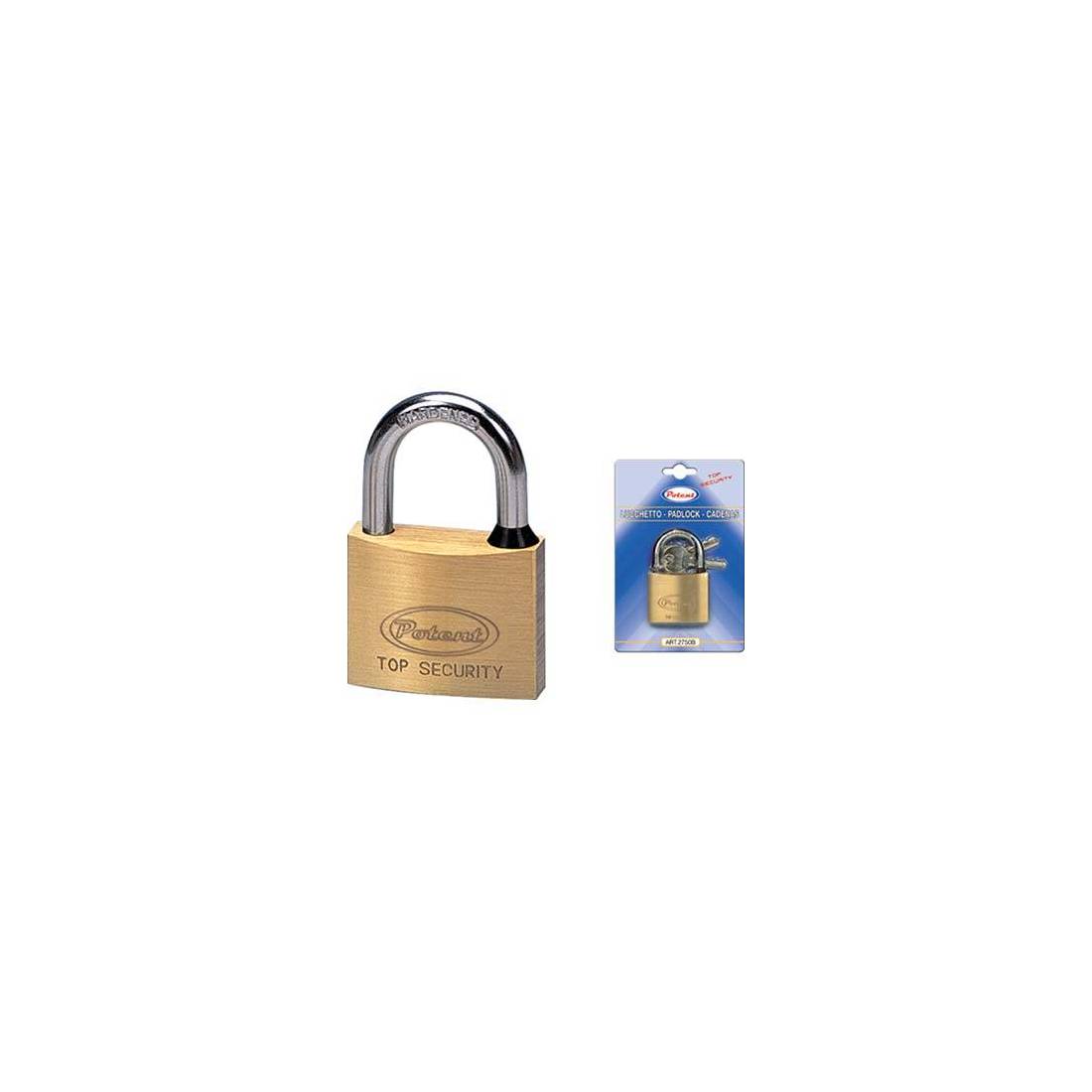 In ottone massiccio lucido. Arco in acciaio cementato e cromato con doppia ritenuta e rotazione di 360°. Arco con guarnizione tenuta acqua. Molla dell’arco inossidabile. Pistoncini di combinazione in ottone. Molle pistoncini in acciaio. Richiamo automatico della chiave nella posizione di estrazione. Estrazione chiave a lucchetto aperto o chiuso. Fornito con 2 chiavi piatte. In blister.
